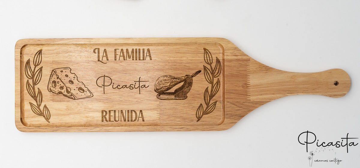 Ein personalisiertes Tablett zu verschenken bedeutet, Nutzen, Design und Gefühl zu schenken. Es ist das perfekte Detail für Hochzeiten, Einweihungen oder Pensionierungen. Stellen Sie sich vor, Sie präsentieren eine Auswahl an Gourmetprodukten auf einem Wurstbrett, das mit einer besonderen Botschaft graviert ist; der Erfolg ist garantiert. Machen Sie jeden Snack zu einem außergewöhnlichen Ereignis mit dem Snack-Tablett von Picasita, eine Investition in Qualität und schöne Momente. Unser Servierbrett ist das fehlende Stück, um Ihre Abendessen mit Freunden zu vervollständigen.