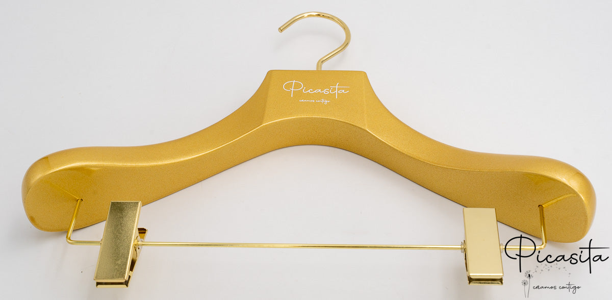 Wenn du die Präsentation deiner Kleidungsstücke verwandeln möchtest, ist unser personalisierter goldener Kleiderbügel die endgültige Wahl. Entworfen für diejenigen, die Glanz und Unterscheidung lieben, sind diese Kleiderbügel nicht nur einfache Halter, sondern Dekorationsstücke, die die Klasse jedes Schranks oder jeder Boutique erhöhen. Hergestellt aus hochwertigem Buchenholz, bieten sie die nötige Stabilität für Mäntel und Anzüge, während ihre glänzende Oberfläche alle Blicke auf sich zieht.