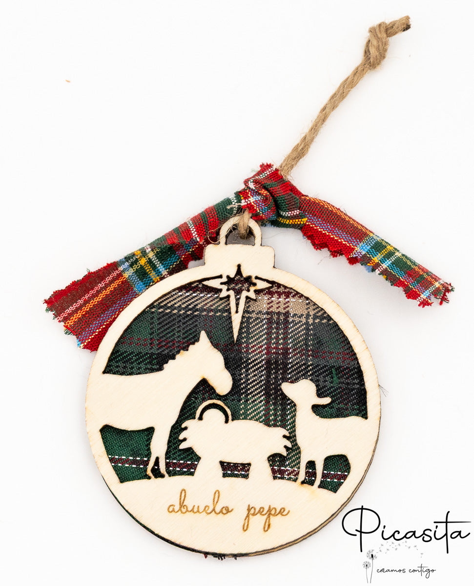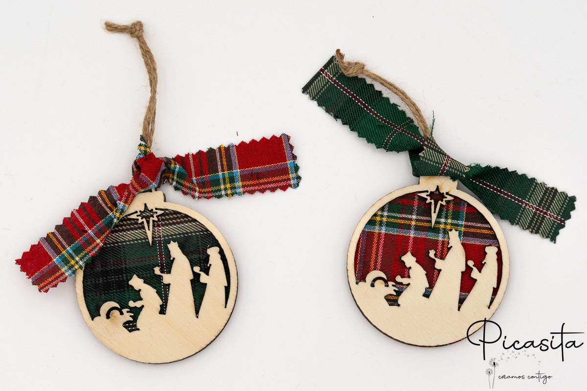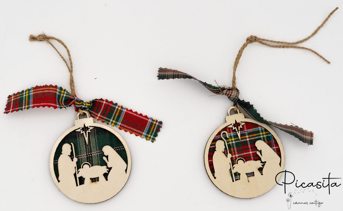 Por otro lado, para quienes prefieren la ternura y la humildad del nacimiento de Jesús, nuestras bolas de navidad del portal de belen son una elección inmejorable. Representando la Sagrada Familia en el pesebre, con la estrella de Belén brillando sobre ellos, estas bolas transmiten un mensaje de paz y amor. La delicadeza de las siluetas sobre el fondo de tela plaid crea una imagen conmovedora que invita a la reflexión y a la gratitud. Ambas opciones están diseñadas para ser un recordatorio constante de los valores y la belleza de la Navidad.