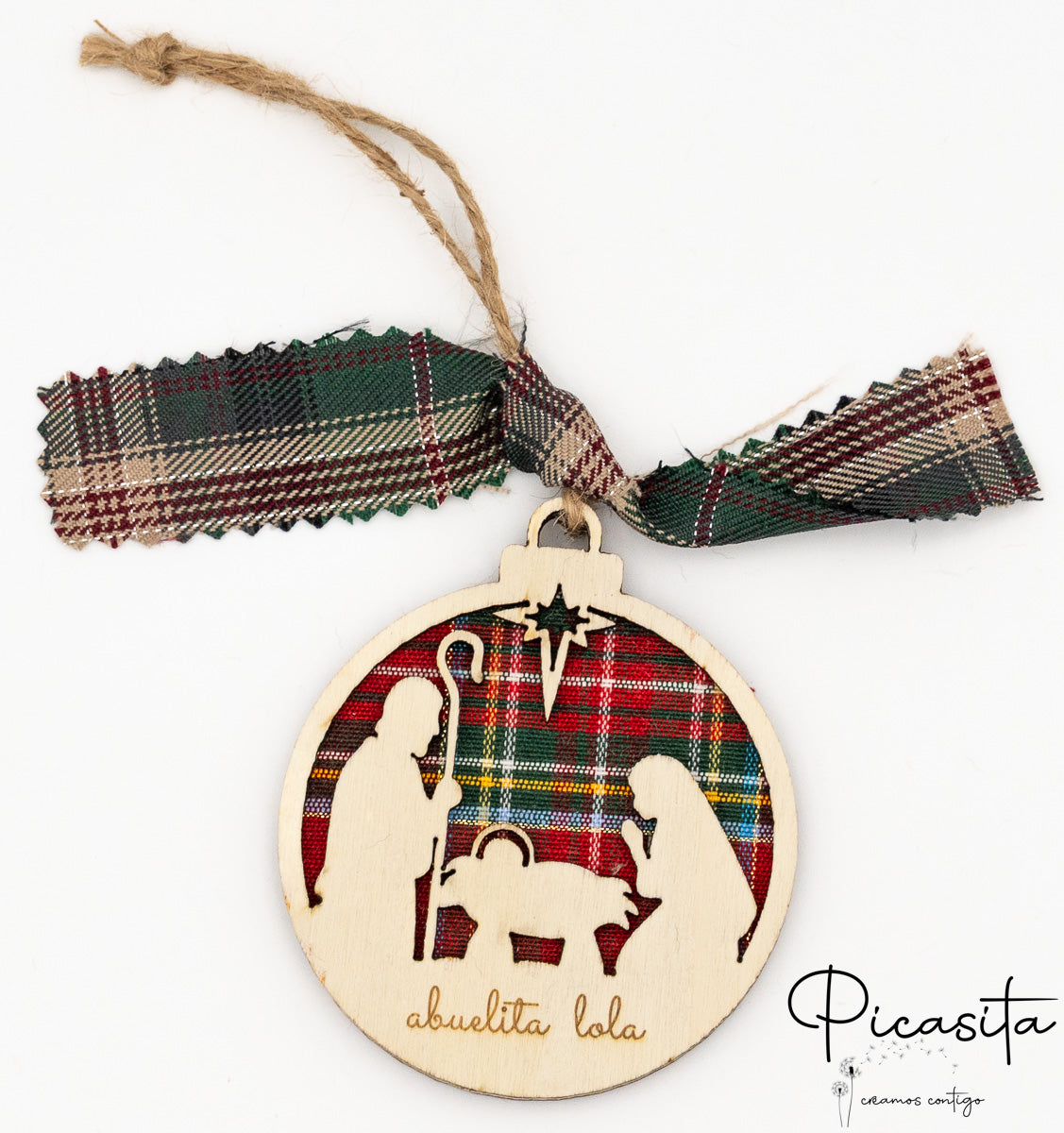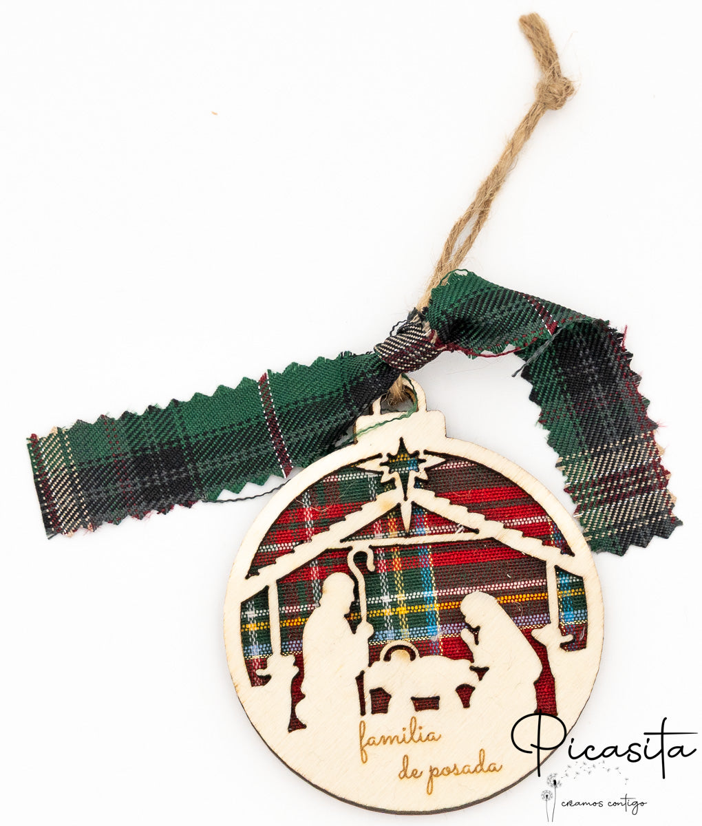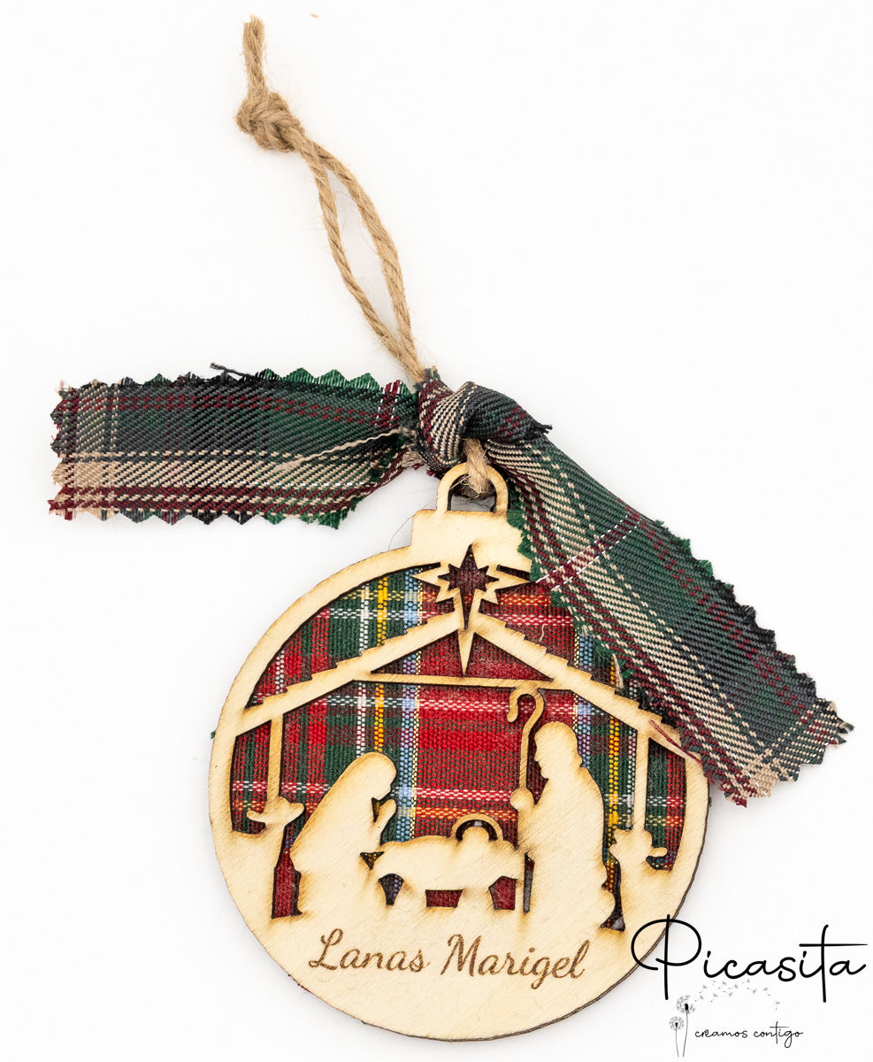 Por otro lado, para quienes prefieren la ternura y la humildad del nacimiento de Jesús, nuestras bolas de navidad del portal de belen son una elección inmejorable. Representando la Sagrada Familia en el pesebre, con la estrella de Belén brillando sobre ellos, estas bolas transmiten un mensaje de paz y amor. La delicadeza de las siluetas sobre el fondo de tela plaid crea una imagen conmovedora que invita a la reflexión y a la gratitud. Ambas opciones están diseñadas para ser un recordatorio constante de los valores y la belleza de la Navidad.
