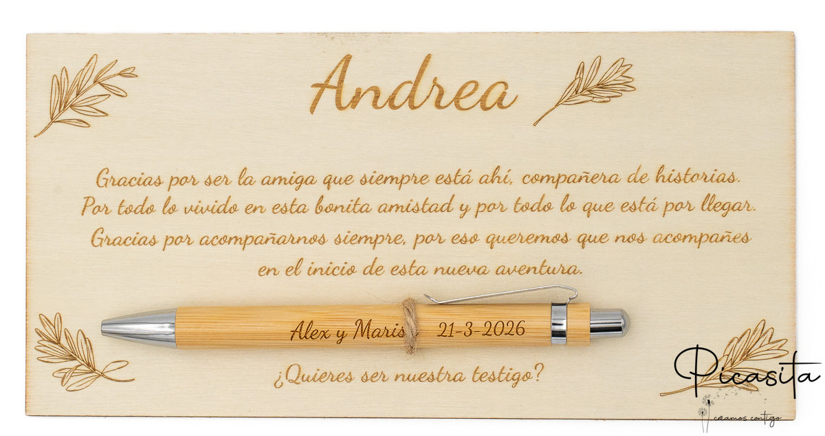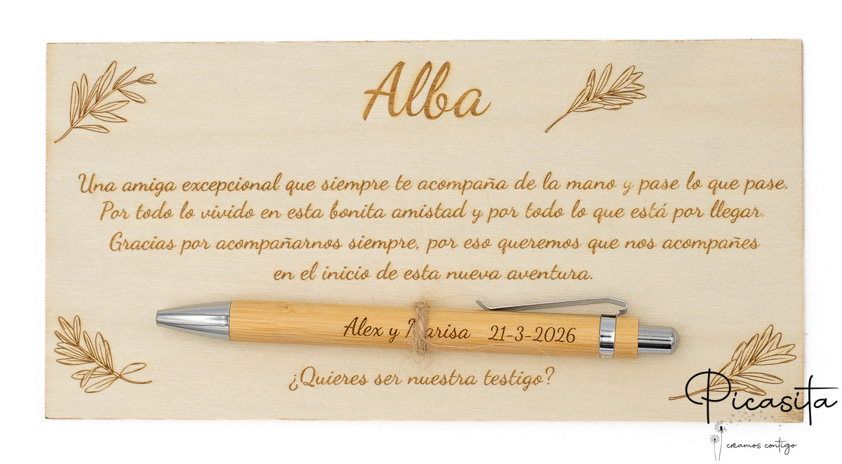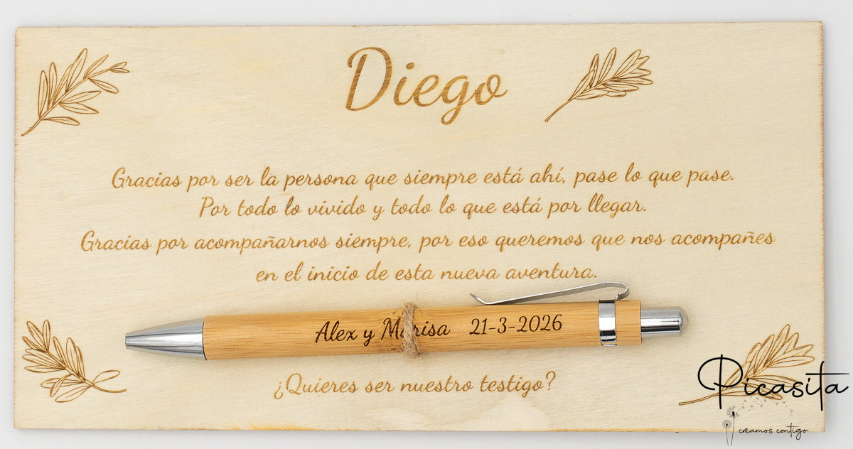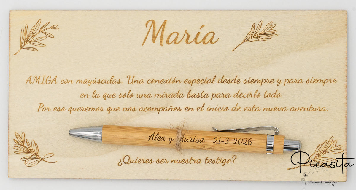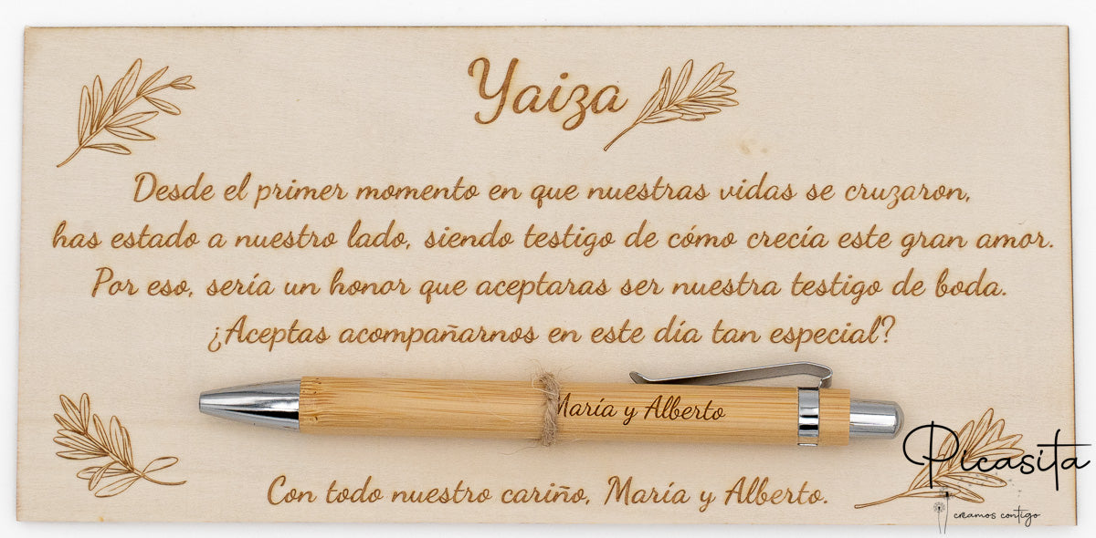 Each plaque and each pen are personalized individually, with care and attention. It is not a mass-produced product, but a handcrafted piece created specifically for that special person. It is this dedication that transforms a simple object into a wedding witness gift that communicates care, appreciation, and the importance of the question you are about to ask: Do you want to be my wedding witness?. Make your proposal as unique as your relationship.