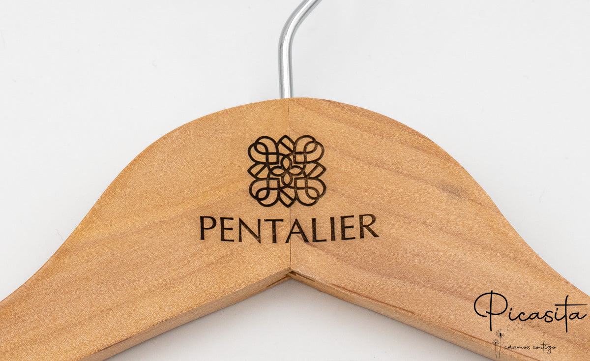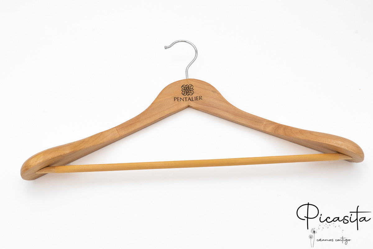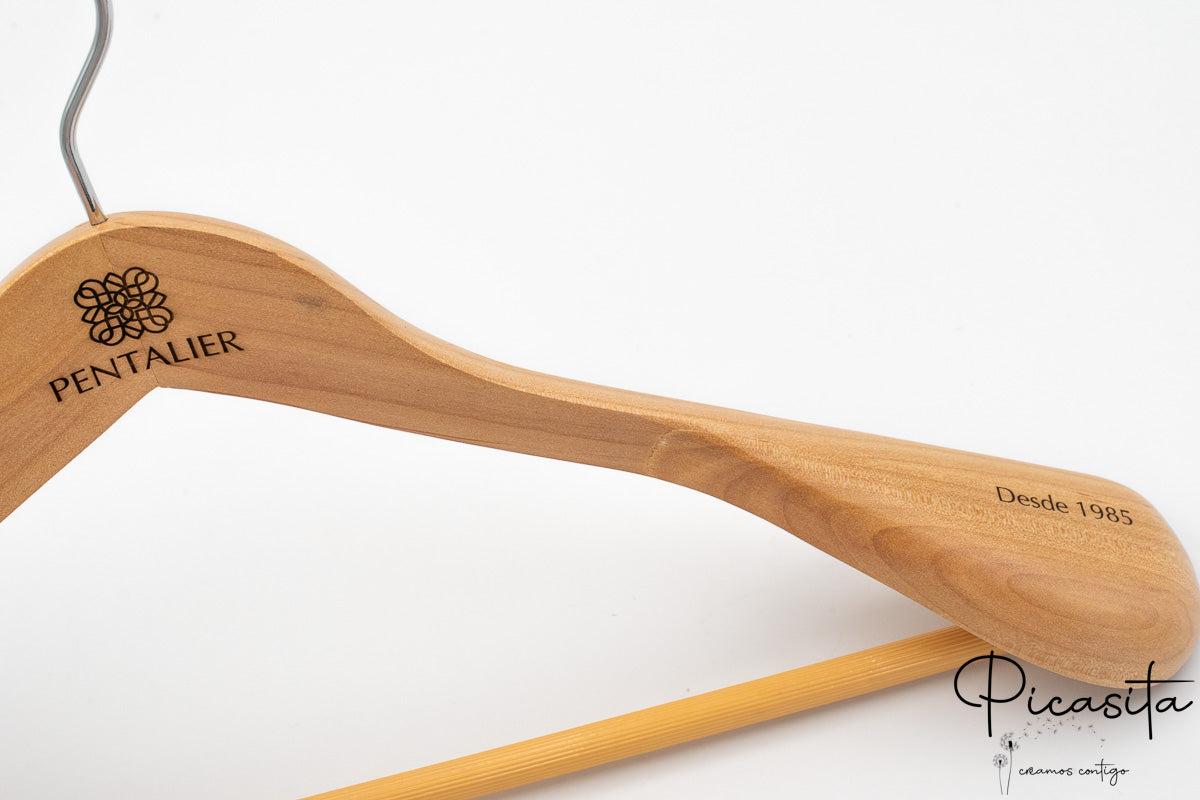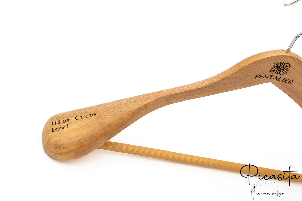 What truly elevates this hanger to a higher category is its customization capability. Imagine a personalized hanger that not only cares for your garments but also carries your brand, your initials, or an exclusive design. At Picasita, we make this possible through high-precision laser engraving. This engraving is done directly on the light wood, creating an elegant and sharp contrast that catches the eye without being ostentatious.