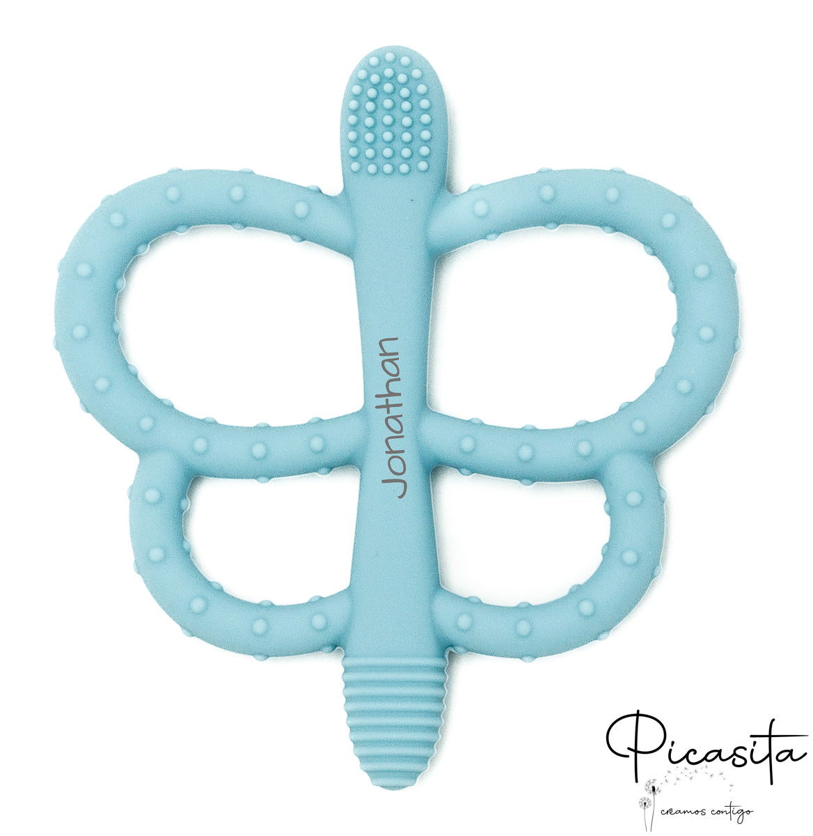What can make this accessory even more special? The possibility of turning it into a unique keepsake. We offer the option to create a personalized teether with your baby's name. We use a high-precision laser engraving technique that marks the name directly onto the silicone. This method is completely safe, as it does not use inks, paints, or any type of chemical product. The result is an elegant, durable personalization that leaves no residue, ensuring that the surface the baby bites remains 100% safe.