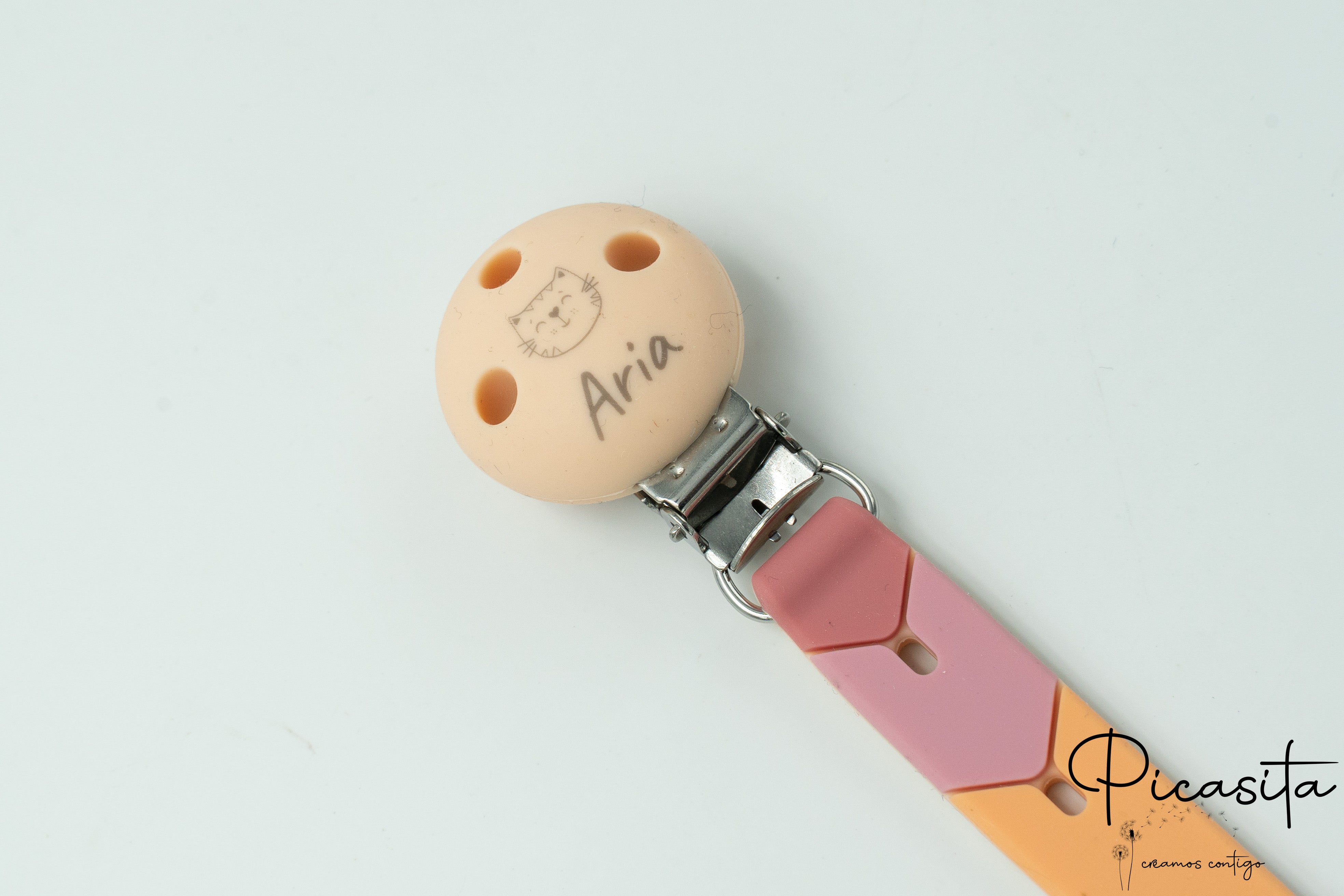 We will take care of creating a unique piece for you, paying attention to every detail to ensure the result is perfect. A colorful and personal pacifier holder that will accompany you in your best moments.