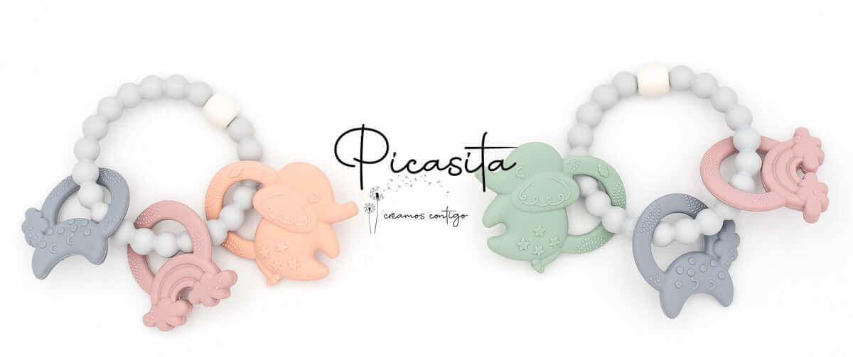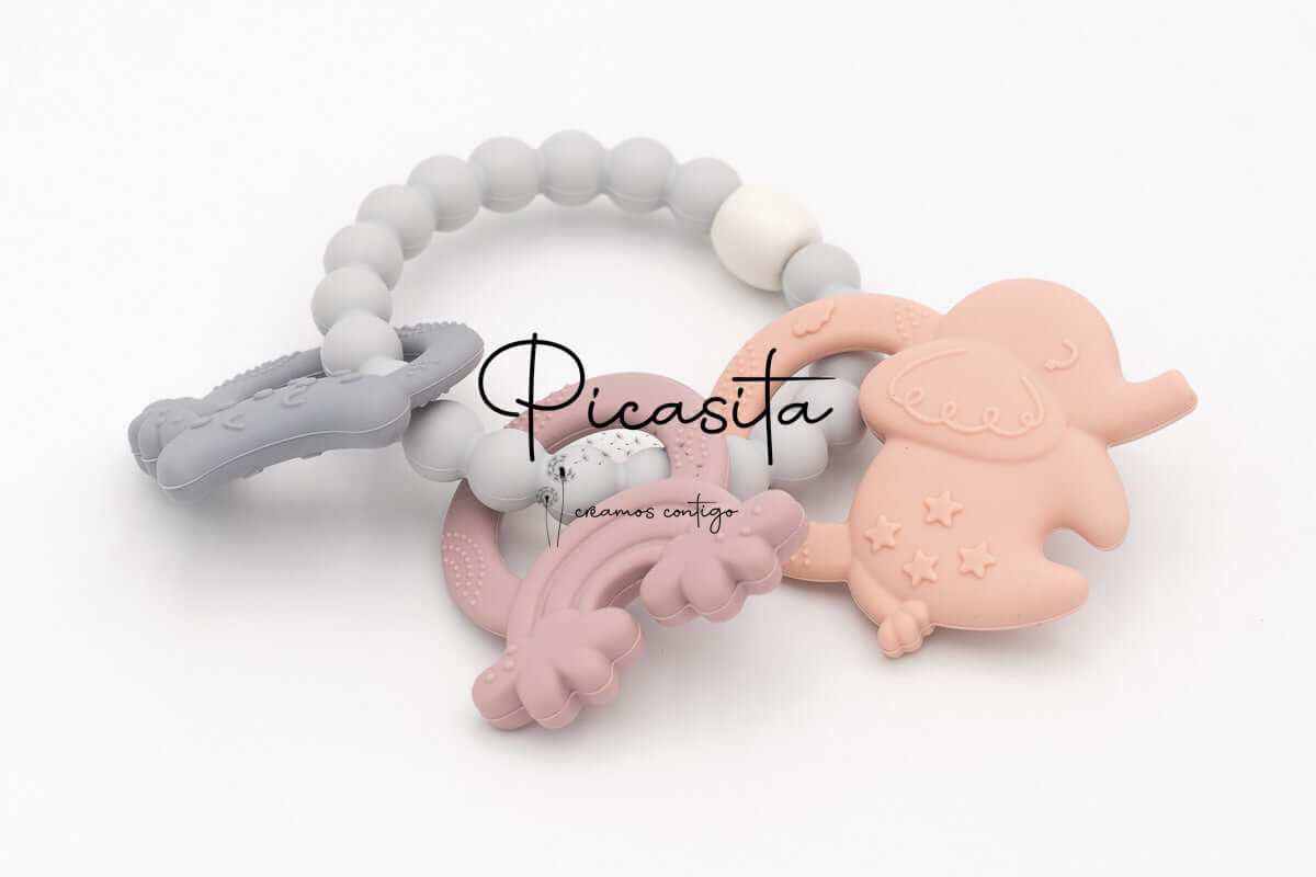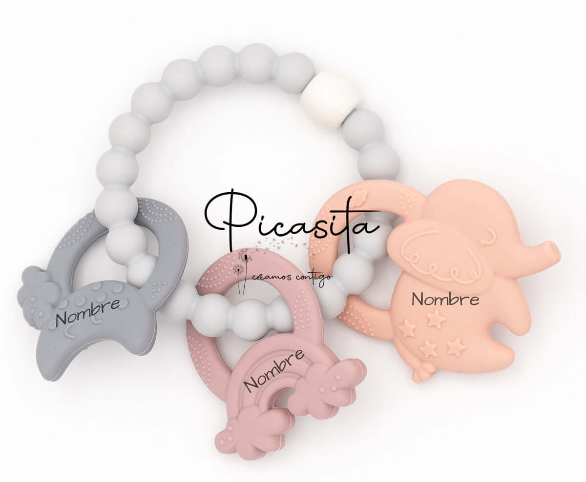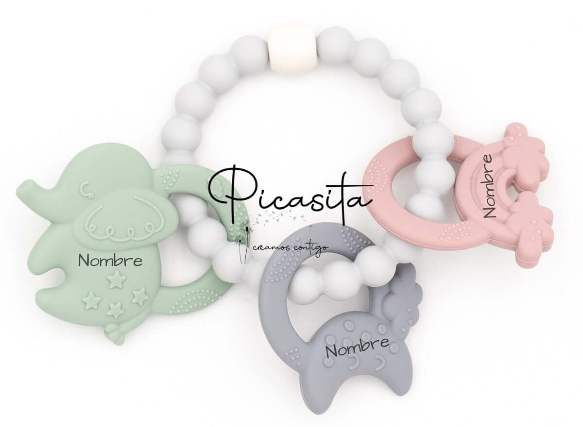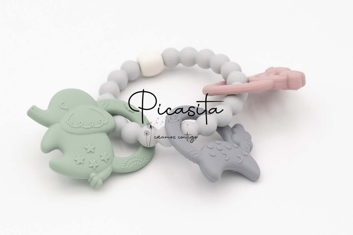 Crafted with exceptional delicacy, its main structure is composed of rounded silicone beads that form a flexible ring, easy for the smallest hands to grasp. The touch is soft and pleasant, inviting the baby to explore it not only with their mouth but also with their fingers, thus fostering their fine motor development. Hanging from the ring, three charming figures in pastel tones capture their attention: a friendly elephant, a playful dinosaur, or a dreamy rainbow, depending on the combination you choose.