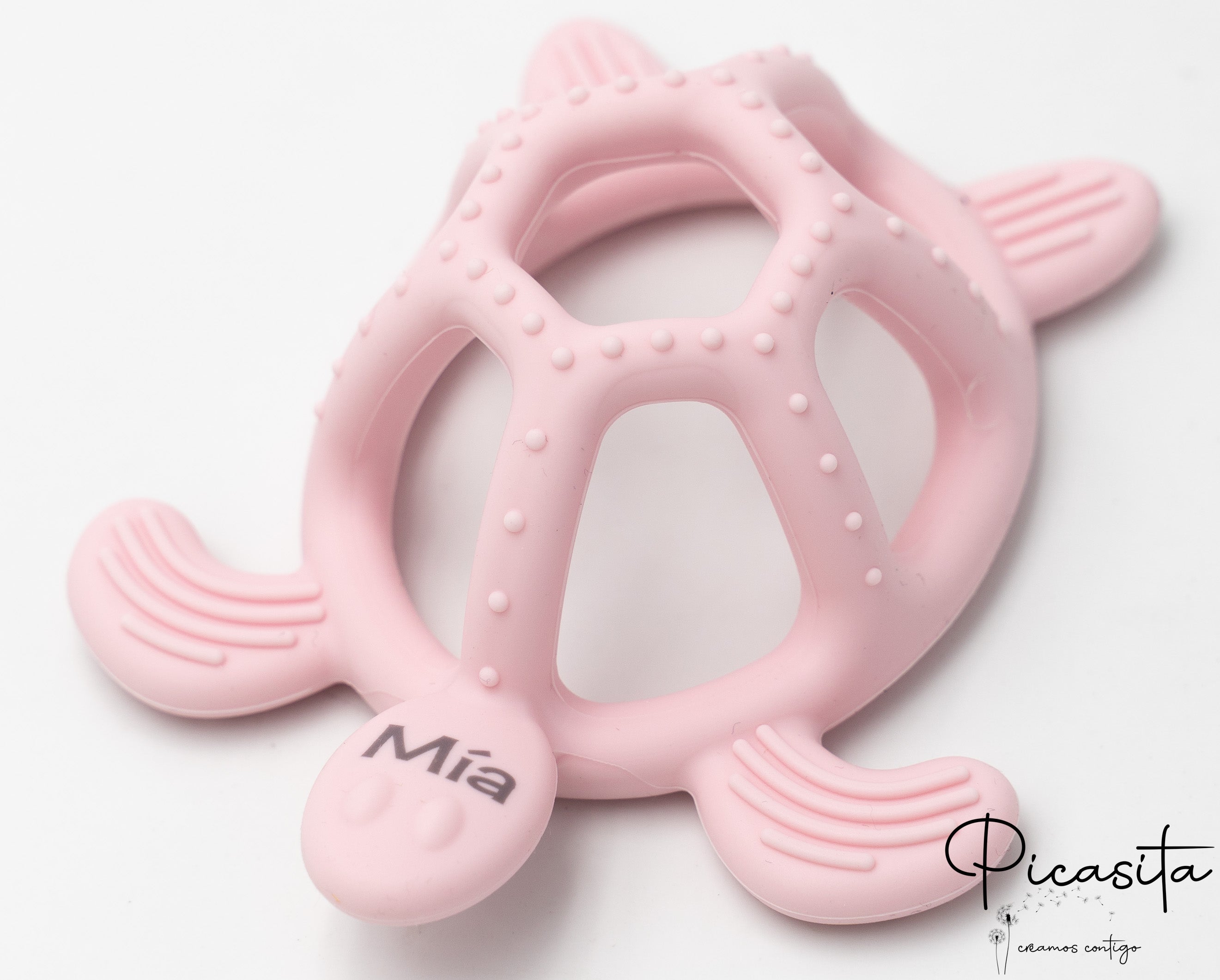 To make this object a truly unique keepsake, we offer the option to personalize it. We engrave your baby's name directly onto one of the flippers, as shown in the image. The most important thing is how we do it: the engraving is done using a technique that alters the color of the silicone itself to a dark gray tone, without using any type of ink, paint, or chemical product. The personalization is as safe as the rest of the teether, merging the name with the material permanently and harmlessly. This detail transforms a practical silicone teether into a personal treasure.