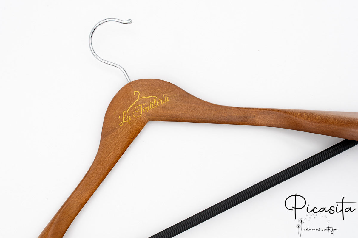 Chez picasita.es, nous croyons que la fonctionnalité peut aller de pair avec l'expression personnelle. C'est pourquoi nous proposons un service de personnalisation qui transforme chaque cintre en une pièce véritablement vôtre. Souhaitez-vous un cintre personnalisé avec votre nom, vos initiales ou un design spécial ? La gravure laser sur la surface blanche du bois crée un effet subtil et sophistiqué, où le contraste révèle la couleur naturelle du bois sous-jacent. Cette finition est notre préférence pour son élégance inhérente, mais si vous cherchez une touche plus audacieuse, nous pouvons également réaliser une gravure avec un effet noir brûlé selon votre goût.