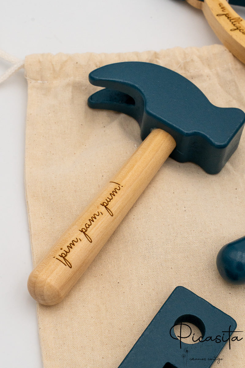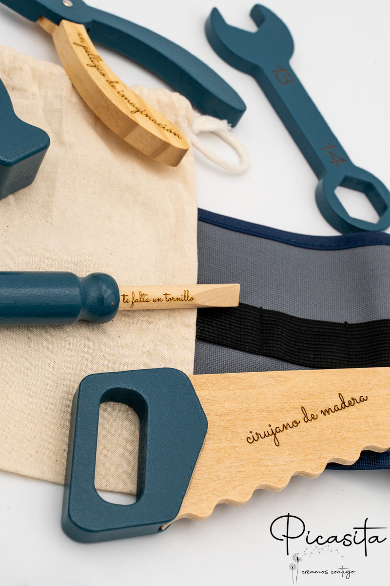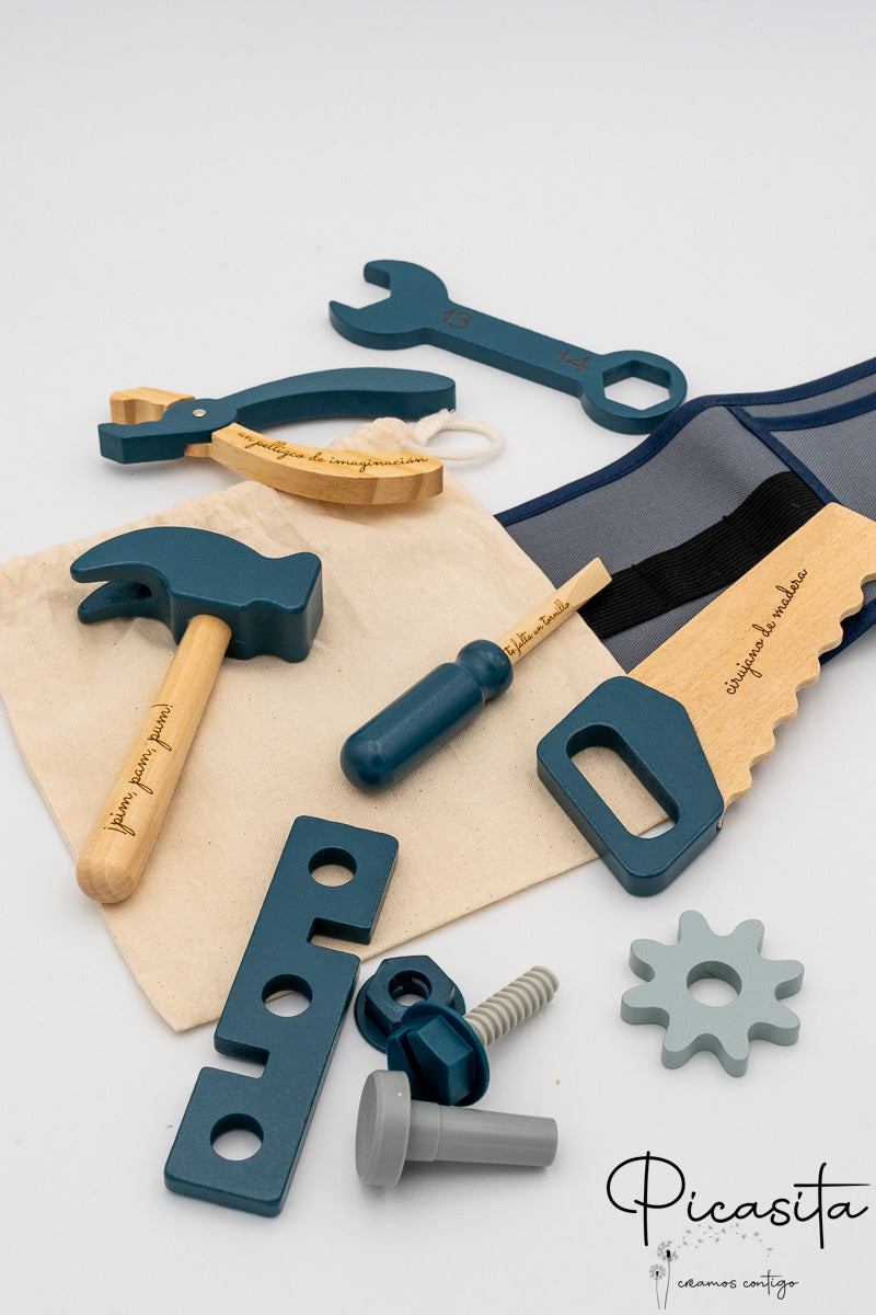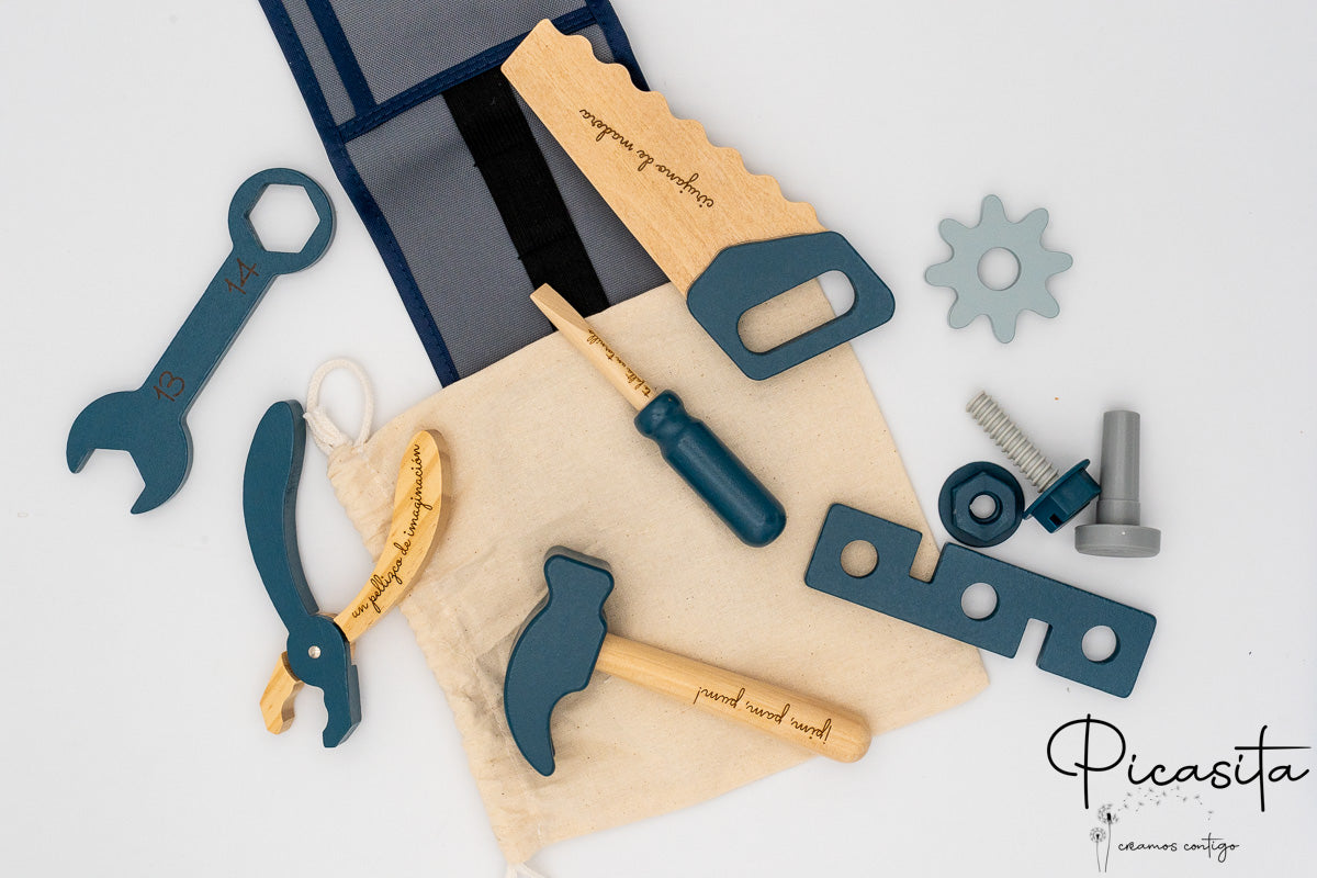 Réponse : Le set inclut un marteau, des pinces, un tournevis, une scie et une clé anglaise (tous avec des messages gravés), ainsi qu'une ceinture à outils, un sac en tissu, et plusieurs pièces de montage comme des vis, des écrous et des plaques en bois.