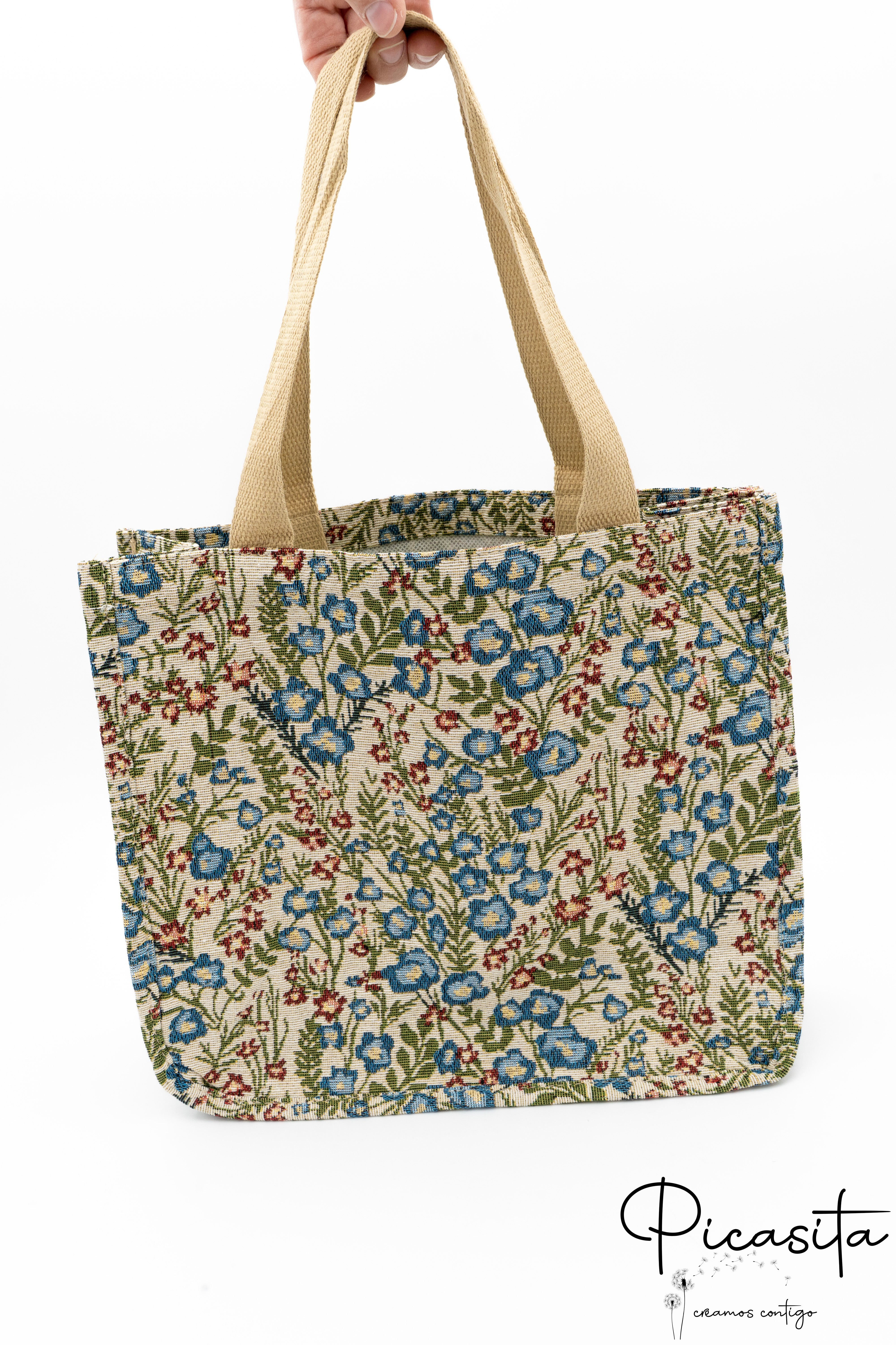 Confectionné avec un tissu épais et résistant, ce sac est prêt à suivre votre rythme. Le tissu, avec son motif floral complexe, rappelle les tapisseries classiques, apportant une texture et une richesse visuelle qui se distinguent des toiles unies conventionnelles. C'est un tote rétro conçu pour durer, pour que vous puissiez le remplir encore et encore sans vous soucier de l'usure prématurée. Ses anses, du même matériau robuste, garantissent une prise en main confortable et sûre, que vous le portiez à la main ou à l'épaule.