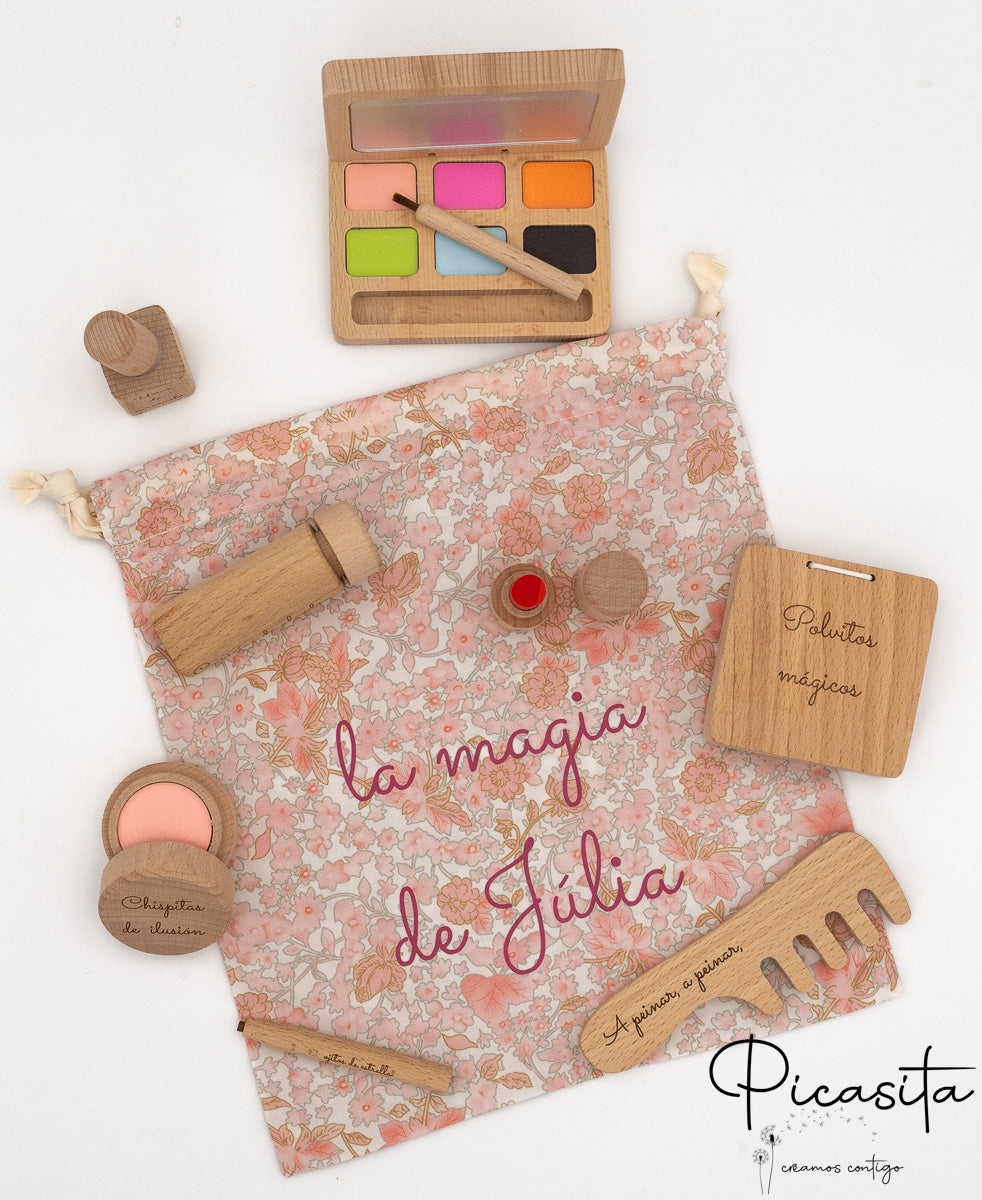 Ciò che trasforma questo set da un semplice giocattolo a un vero tesoro è la personalizzazione. Sappiamo che non c'è nulla che faccia più piacere a un bambino che vedere il proprio nome sulle proprie cose. Dà un senso di proprietà, di identità e di importanza. Per questo, questo meraviglioso gioco di trucco viene accompagnato da una preziosa borsa di stoffa per conservarlo tutto, e su di essa, ricamato o stampato con cura, il nome del piccolo o della piccola.