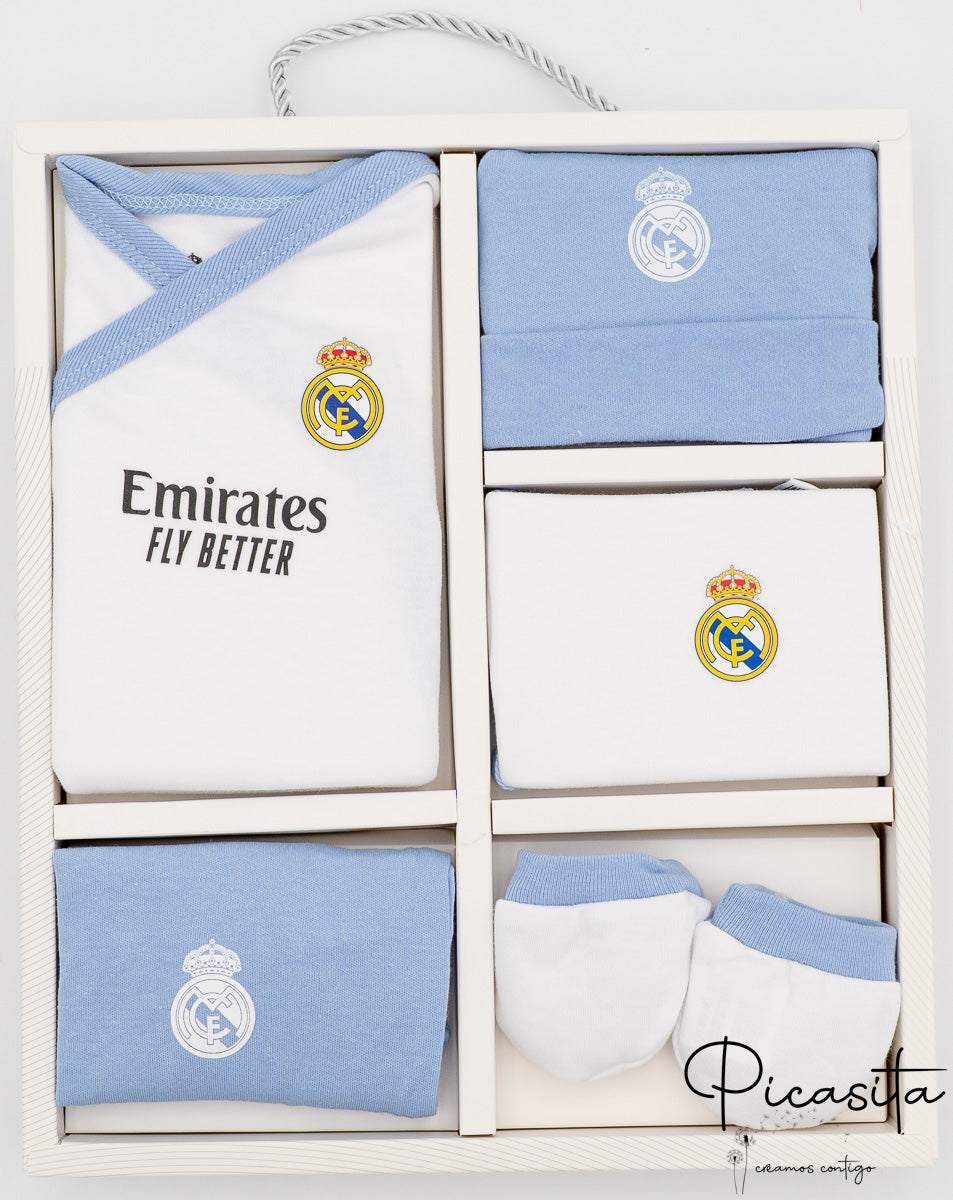 Cerchi un regalo per un baby shower o per conoscere un neonato in una famiglia madridista? Non cercare oltre. Questo completo neonato real madrid è il dettaglio perfetto che emozionerà i genitori. La presentazione nella sua confezione con scomparti individuali per ogni capo gli conferisce un tocco premium, rendendolo un regalo pronto da consegnare che sarà sicuramente al centro dell’attenzione.