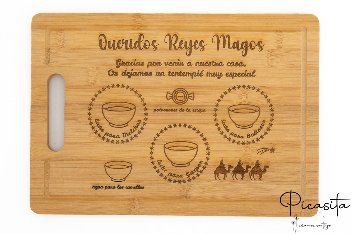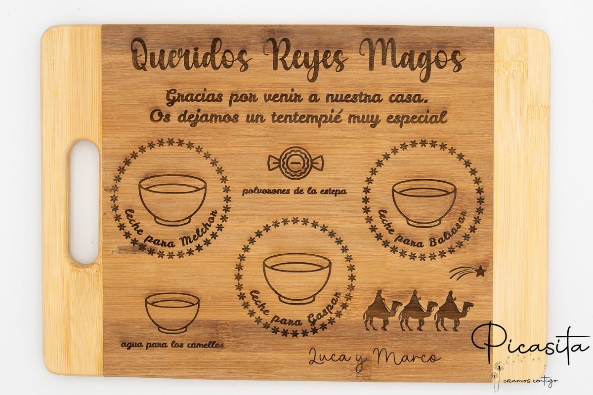 En Picasita.es, nos enorgullece ser parte de tus celebraciones más queridas. Con cada bandeja Reyes Magos que creamos, ponemos nuestro corazón y nuestra dedicación para que la magia de estas fechas sea aún más palpable en tu hogar. Elige la tuya, personalízala con el nombre de tus hijos y prepárate para vivir momentos inolvidables, llenos de sonrisas, sueños y la ilusión que solo la Noche de Reyes puede ofrecer. Haz que este año, y todos los venideros, la llegada de los Reyes Magos sea una experiencia aún más mágica y personal con una de nuestras exclusivas bandeja de madera Reyes Magos grabadas a láser. Será el complemento perfecto para una Noche de Reyes inolvidable, una pieza que tus hijos recordarán con cariño y que formará parte de sus tradiciones más queridas.