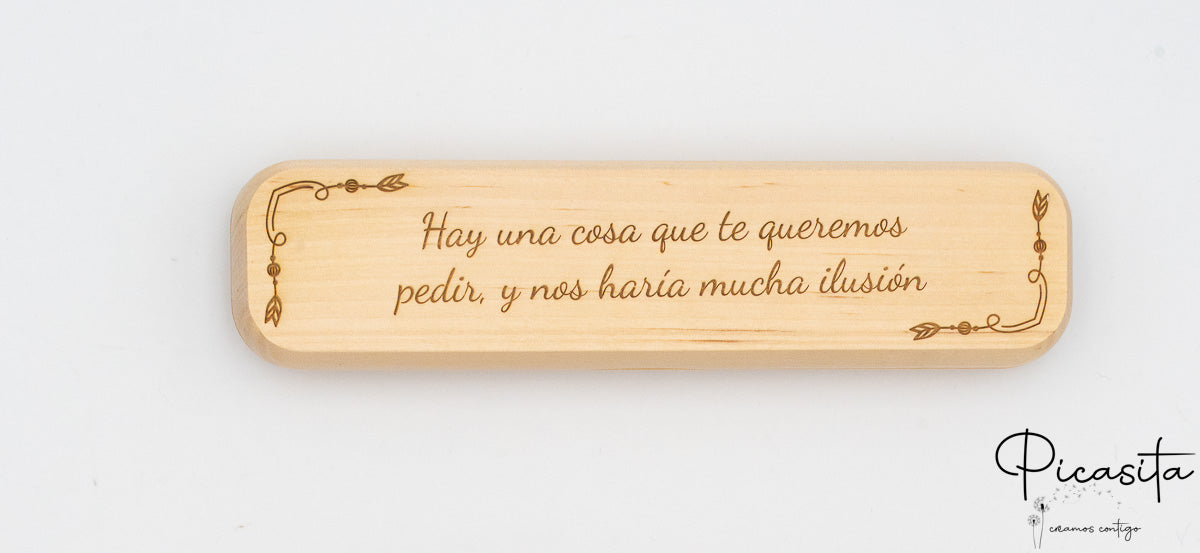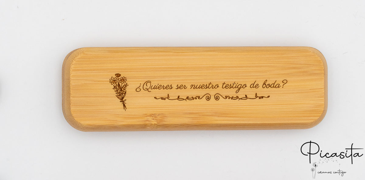 ¿Cómo pedir a esa persona especial que sea parte activa de uno de los días más importantes de vuestras vidas? La pregunta "¿quieres ser mi testigo de boda?" merece ser formulada de una manera que refleje el cariño y la consideración que sentís. Nuestro exclusivo estuche con bolígrafo personalizado es la respuesta perfecta. Imagina la emoción al abrir una pieza artesanal de madera o bambú, donde vuestras propias palabras, grabadas con precisión láser, plantean la cuestión crucial. Es más que un presente; es el inicio de una nueva etapa compartida, un compromiso sellado con elegancia y significado. Este regalo testigo de boda no solo invita, sino que honra y celebra la relación que os une.