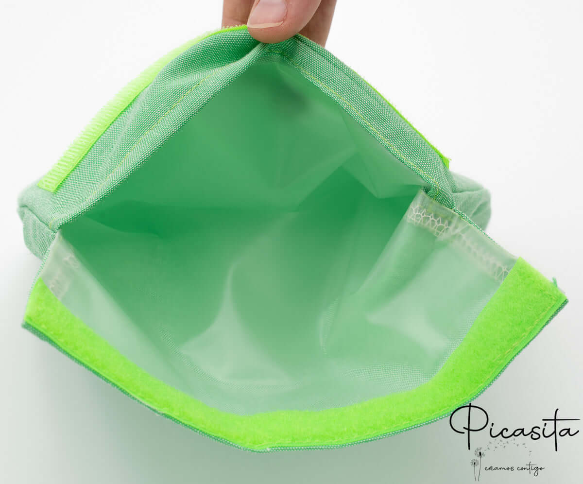 Respuesta: El exterior está hecho de una tela resistente y el interior de un plástico impermeable. El sistema de cierre es una tira de velcro que garantiza que la bolsa no se abra accidentalmente.