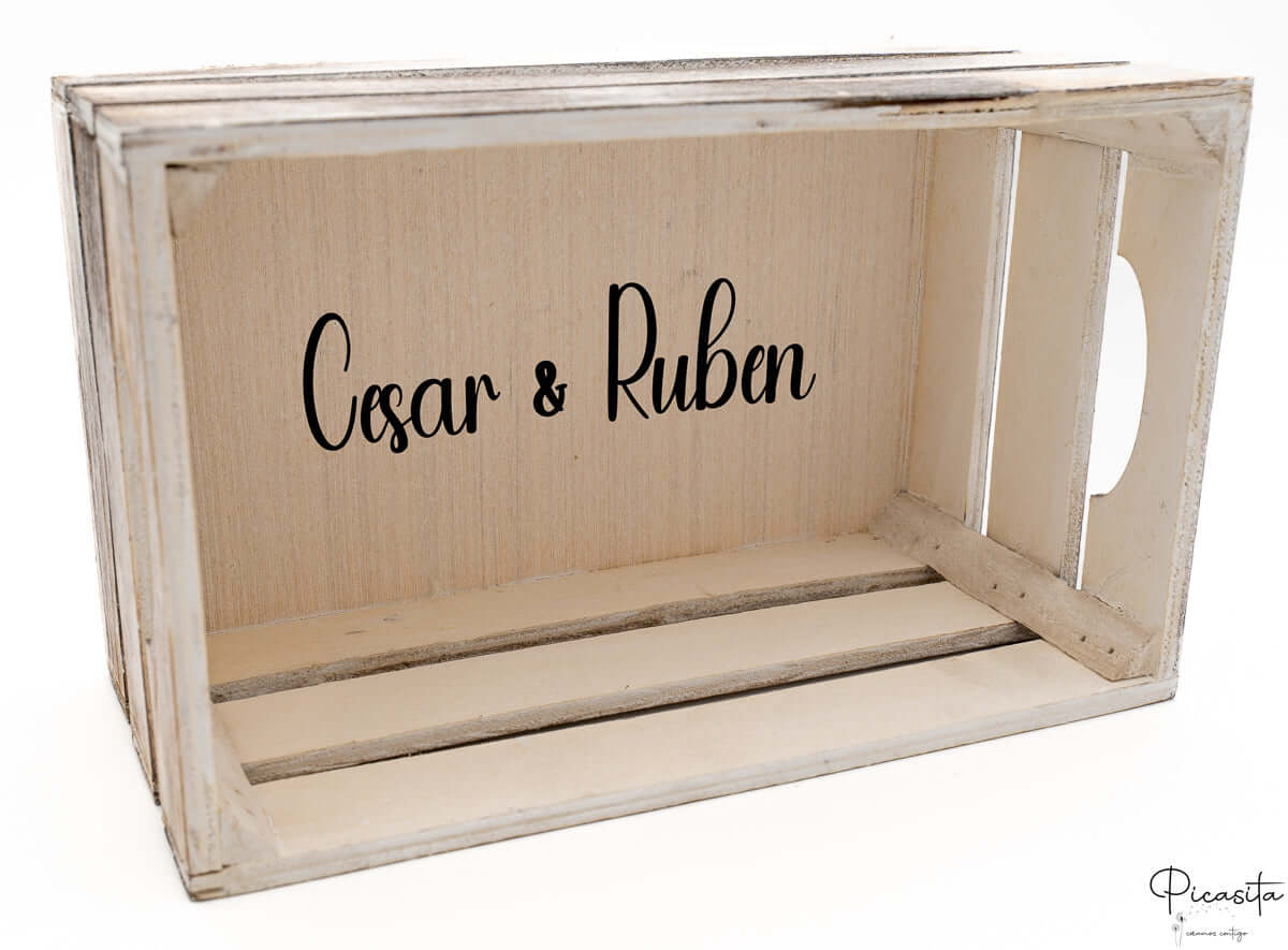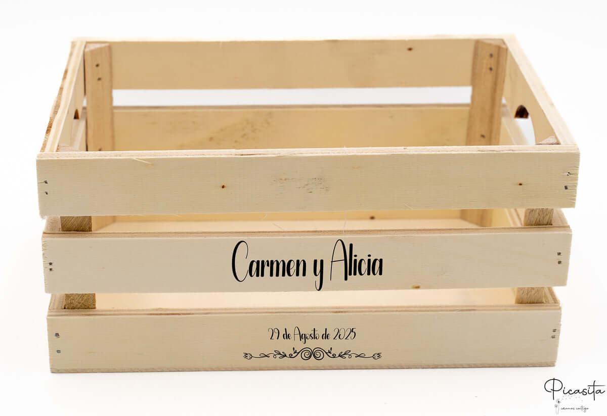 Lo que realmente hace única a esta caja de madera es la posibilidad de personalizarla. Mediante una precisa técnica de grabado láser, podemos inscribir en ella lo que desees. Para una boda, los nombres de la pareja y la fecha del enlace son la opción más elegida, a menudo acompañados de delicadas filigranas o motivos florales. El resultado es un objeto que no solo sirve para el día de la boda, sino que se convierte en un recuerdo tangible que podréis usar después en vuestro hogar.