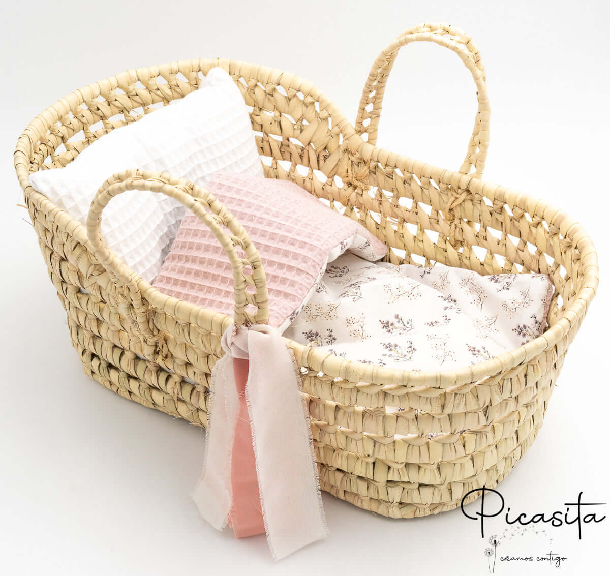 En Picasita creemos en el valor de lo auténtico. Por eso, cada moises hecho a mano es una pieza especial. Ofrecemos dos variantes exclusivas: Brezo y Lavanda. La diferencia principal reside en el acabado de su confección; mientras uno presenta costuras vistas con un aire más rústico, el otro ofrece un acabado pulido, manteniendo ambos la esencia de un producto 100% artesano. Este capazo para muñeca está trenzado con fibras naturales, aportando una textura orgánica y resistente que conecta al niño con materiales de calidad.