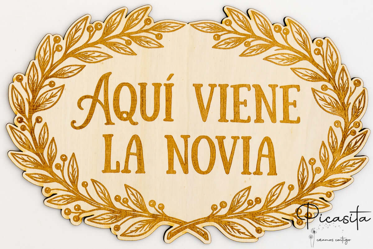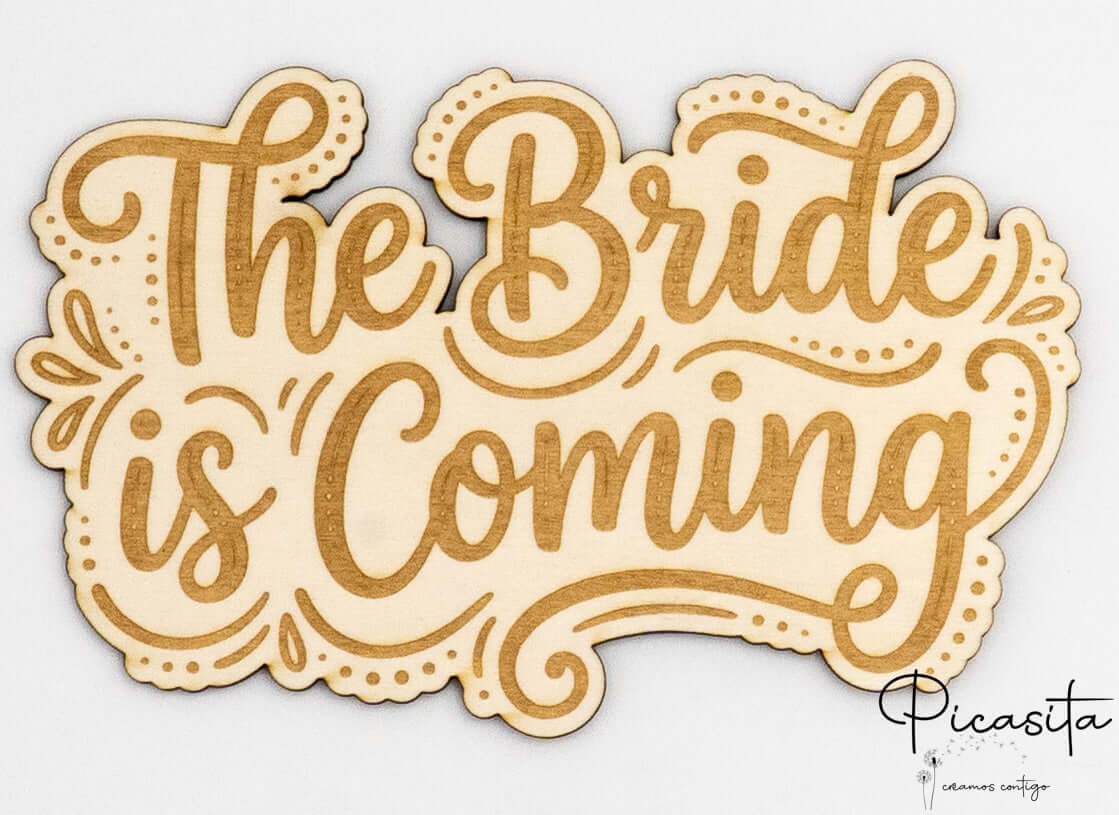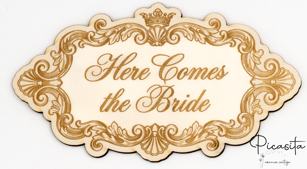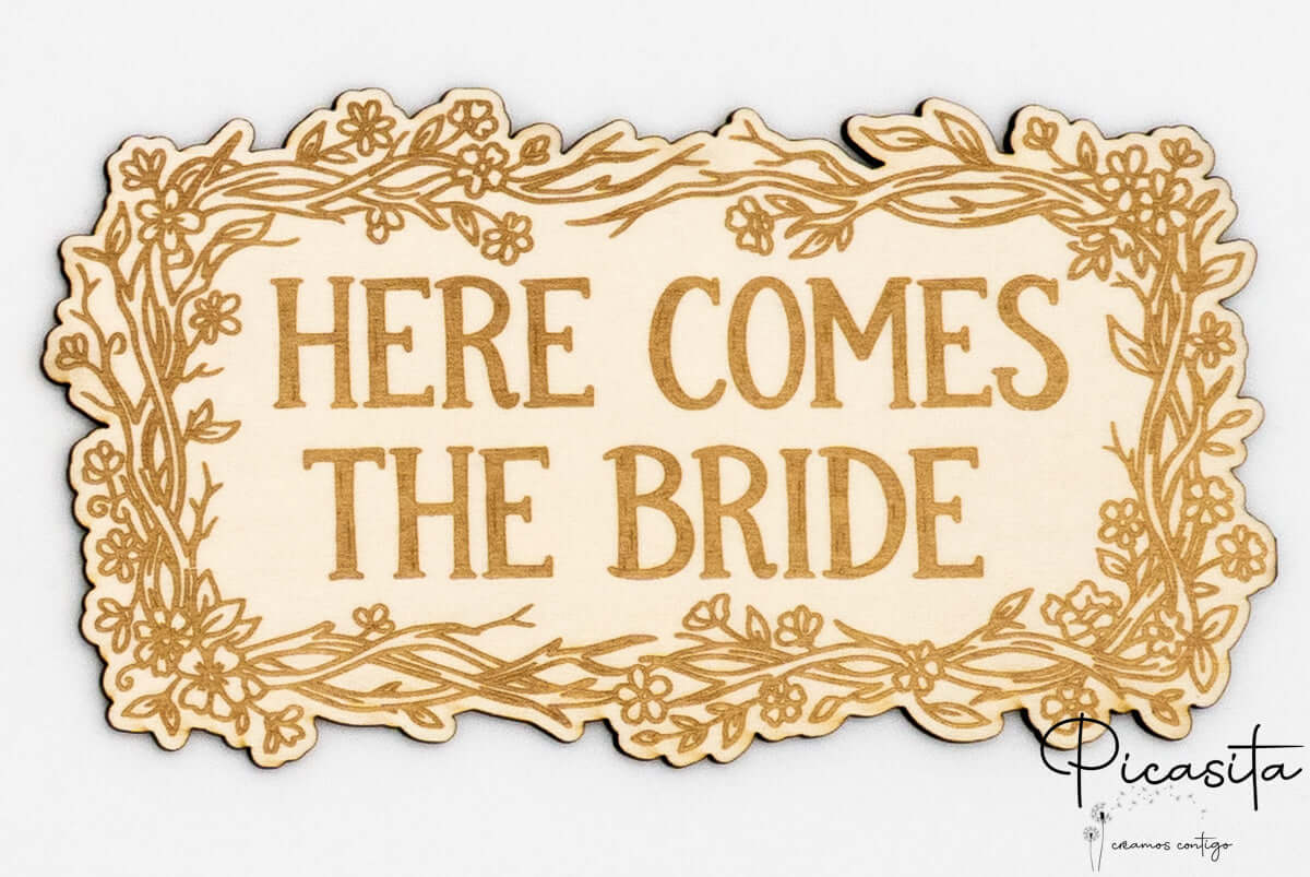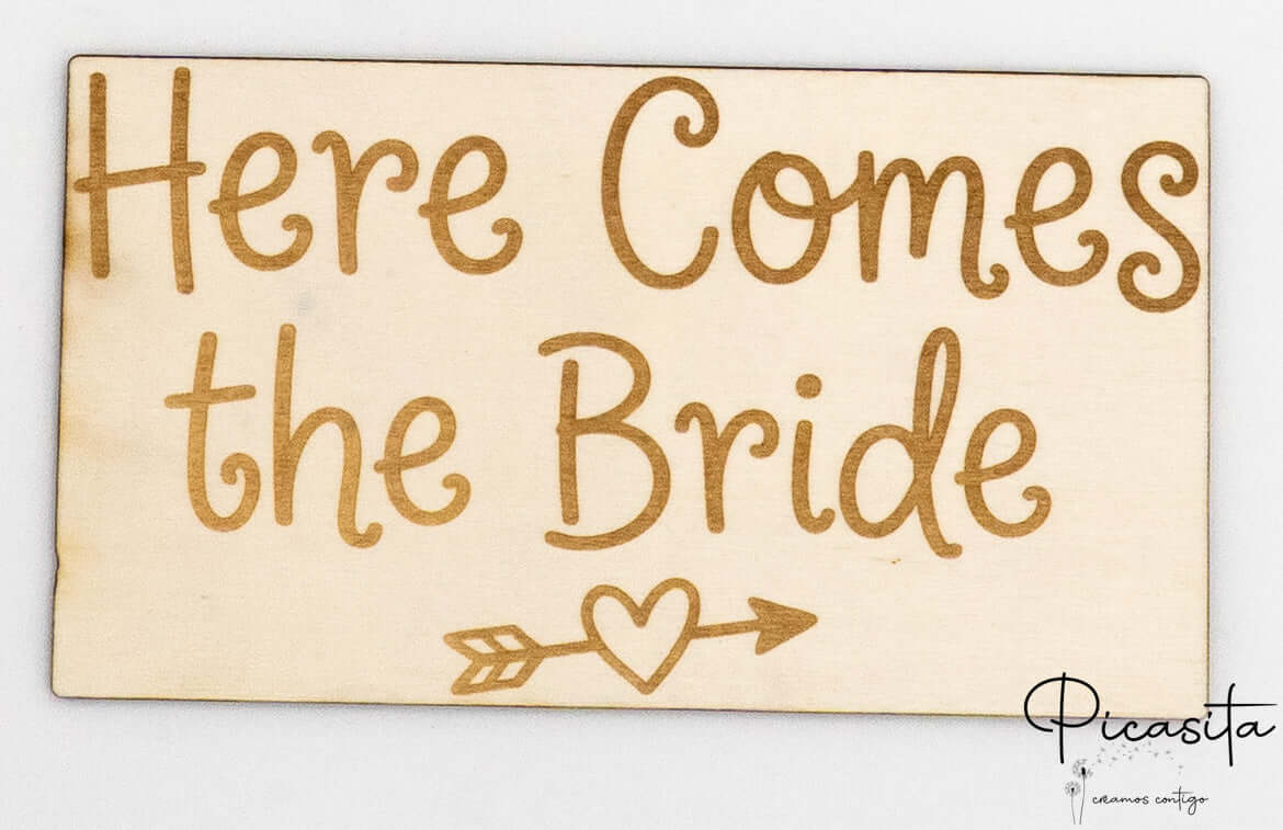 Gracias a nuestra tecnología de grabado láser de alta precisión, el texto aqui llega la novia queda marcado de forma permanente sobre la madera con un acabado quemado oscuro y elegante. No es tinta que se borra, es un grabado de calidad.