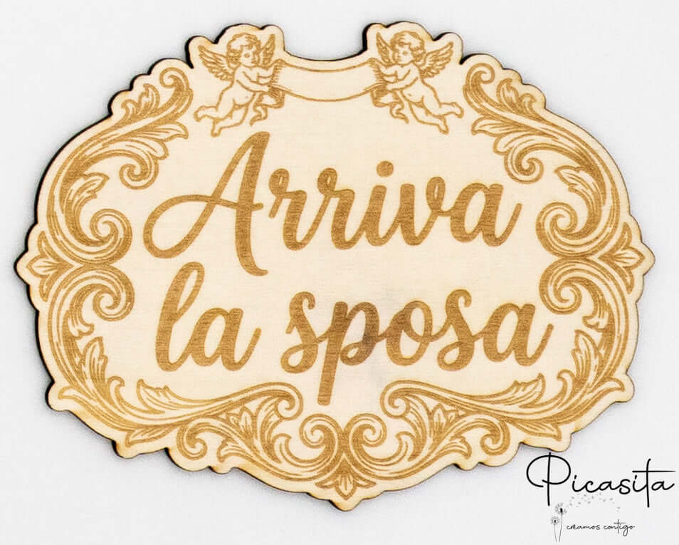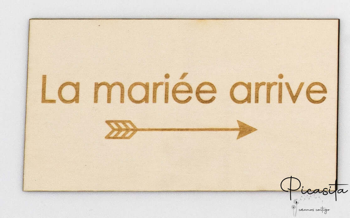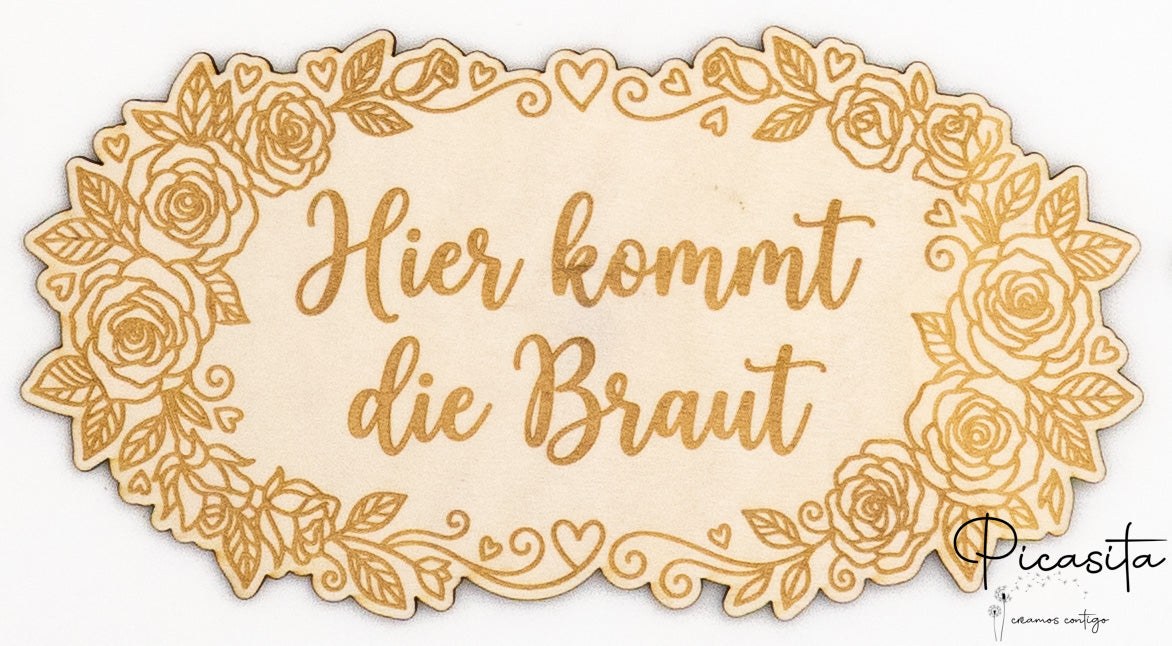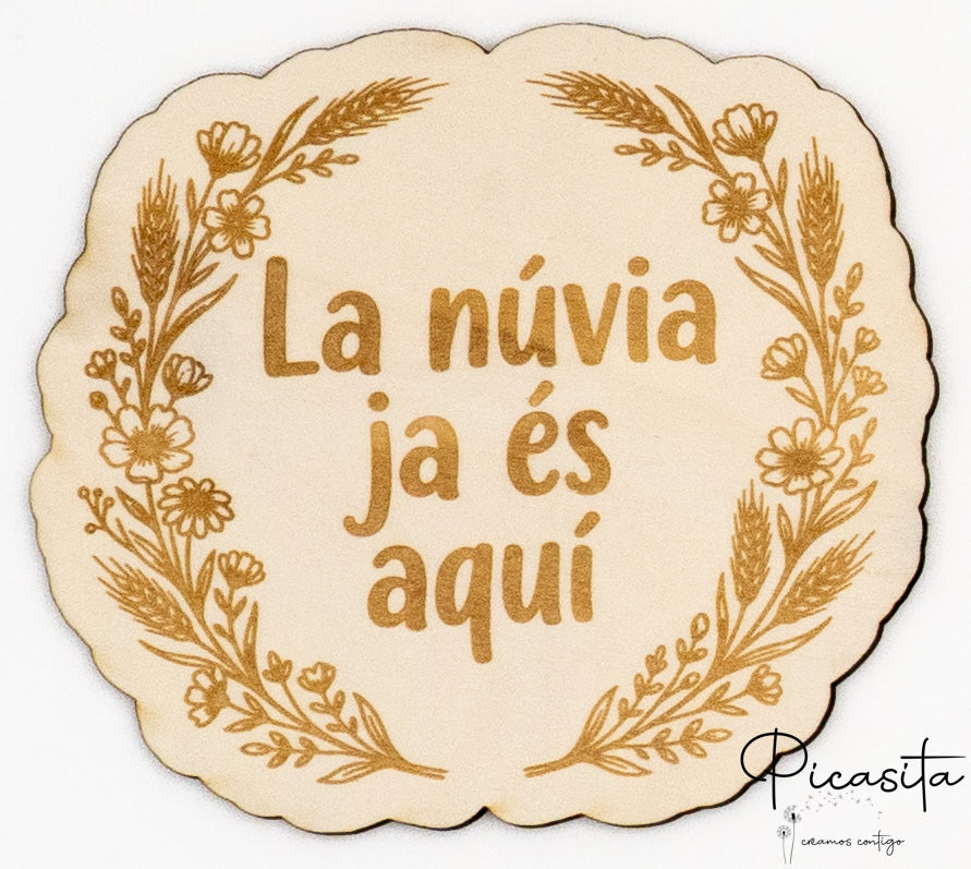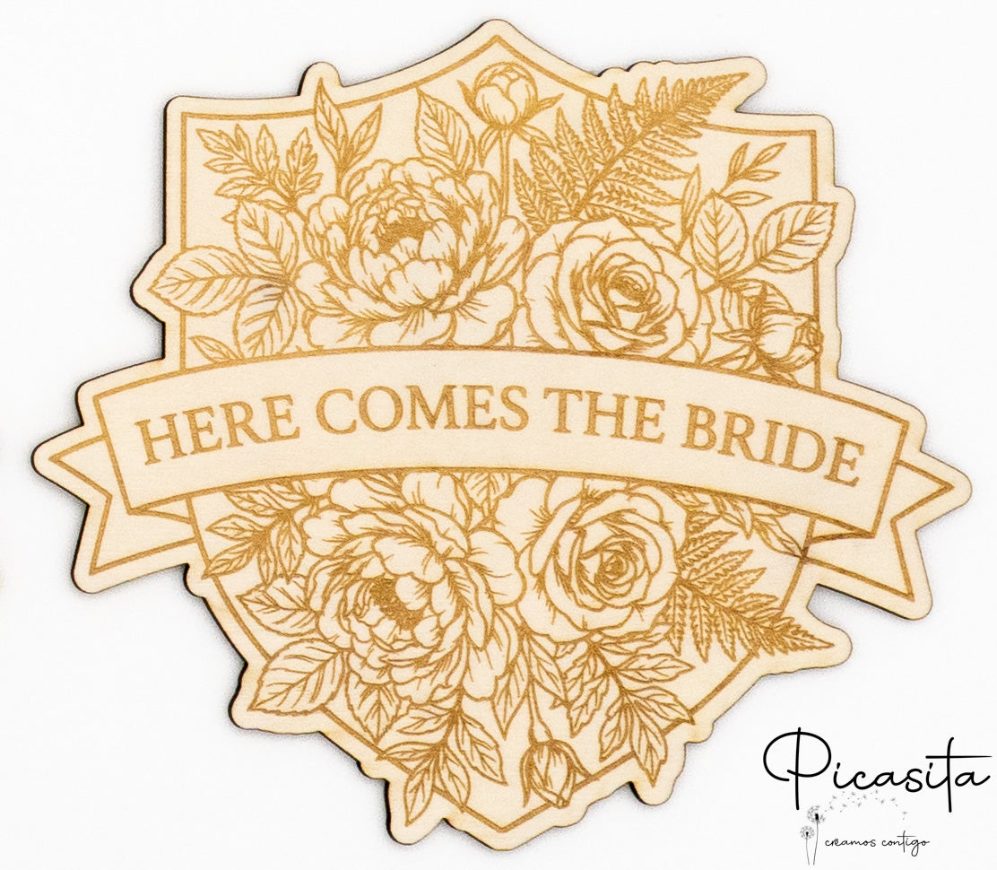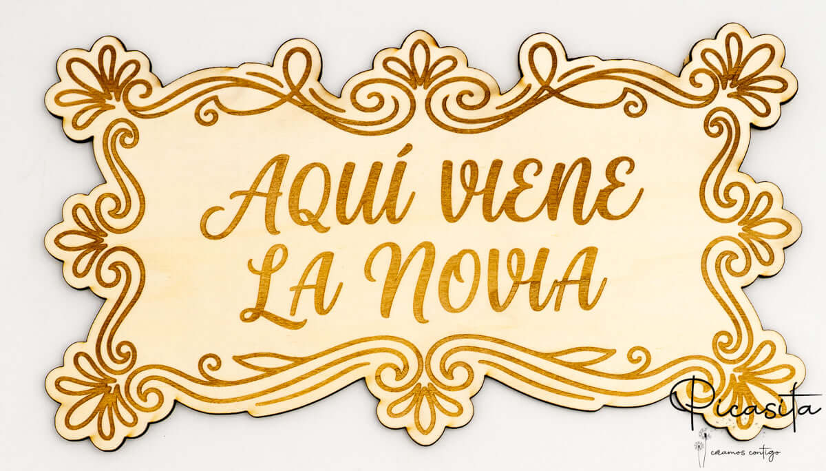 Gracias a nuestra tecnología de grabado láser de alta precisión, el texto aqui llega la novia queda marcado de forma permanente sobre la madera con un acabado quemado oscuro y elegante. No es tinta que se borra, es un grabado de calidad.