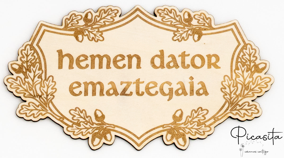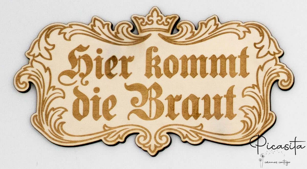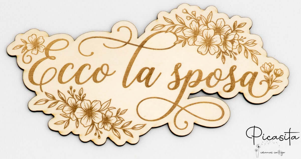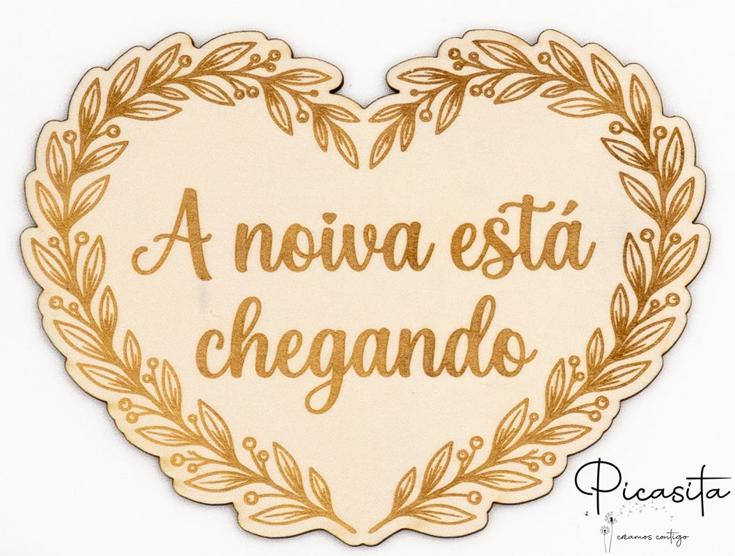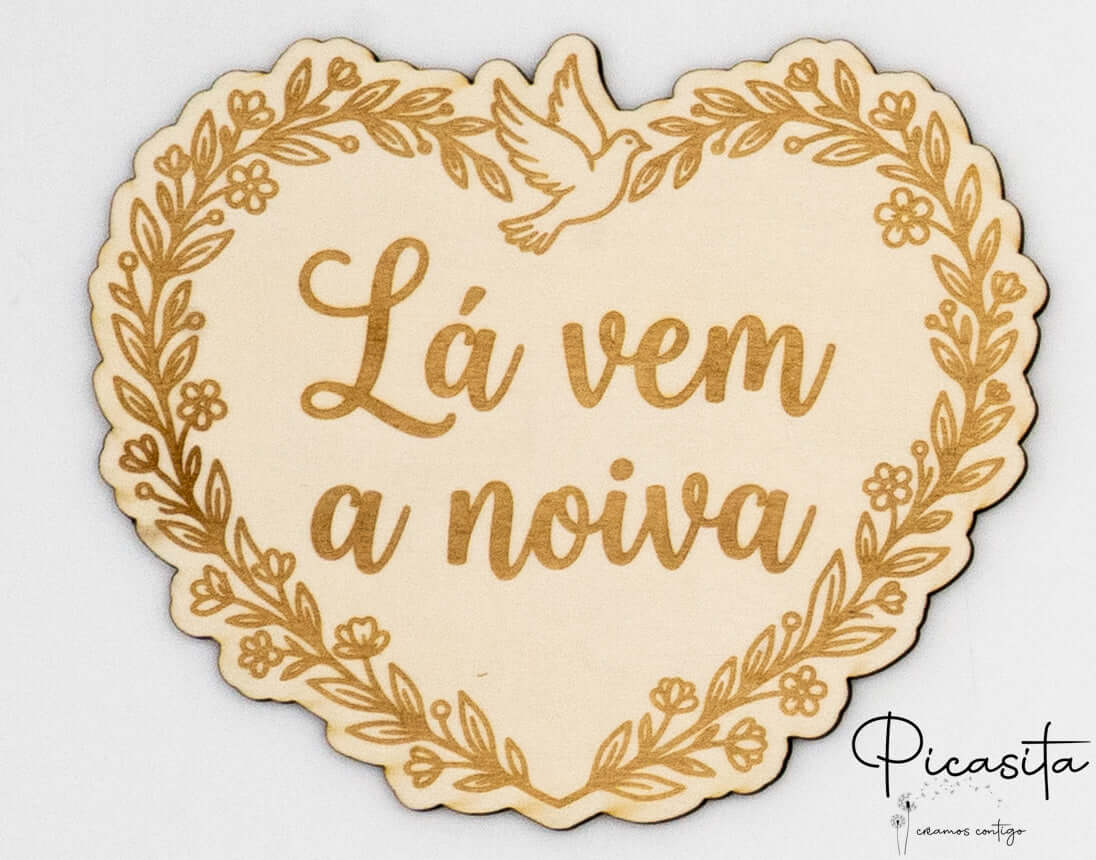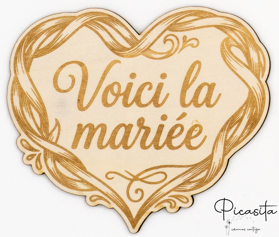 Gracias a nuestra tecnología de grabado láser de alta precisión, el texto aqui llega la novia queda marcado de forma permanente sobre la madera con un acabado quemado oscuro y elegante. No es tinta que se borra, es un grabado de calidad.