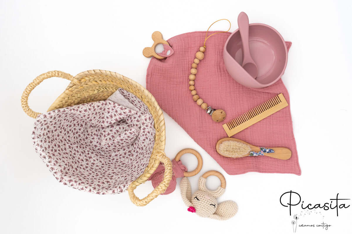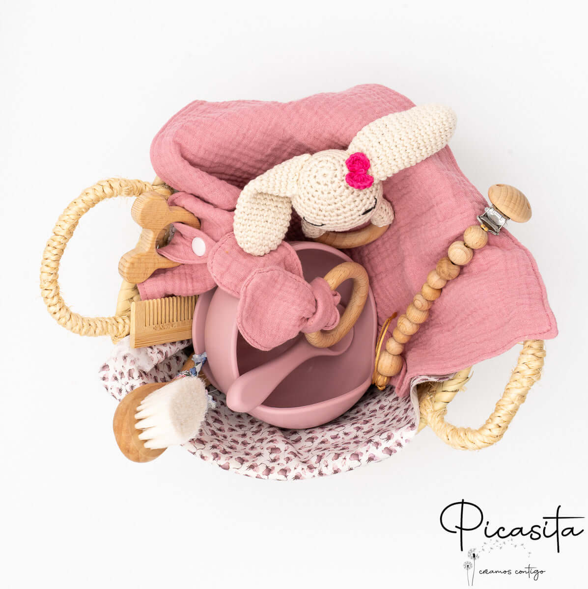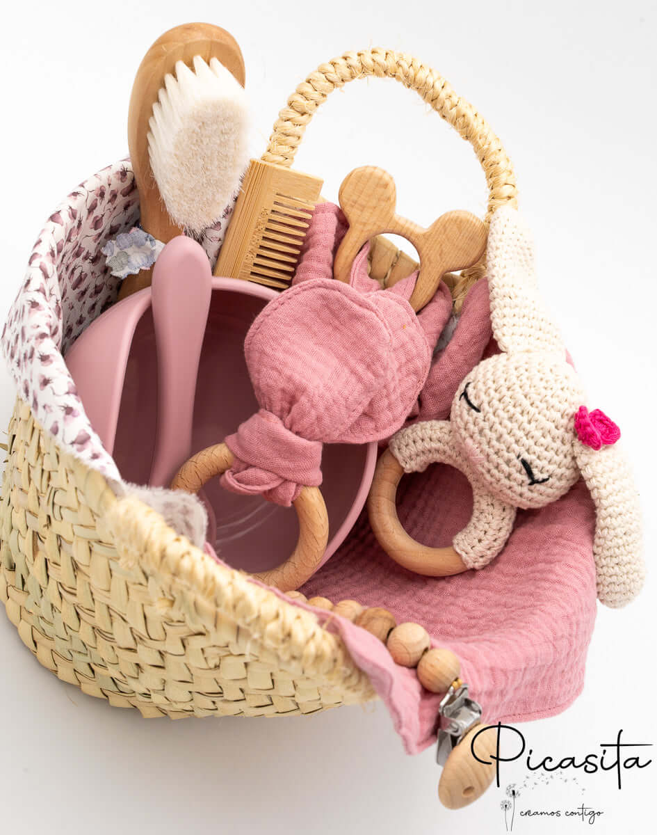 Respuesta: Incluye una cesta de hoja de palma, un kit con muselina, mordedor personalizado, chupetero personalizado y peine personalizado. También contiene un cepillo de lana ultrasuave, un cuenco de silicona personalizado y, de regalo, un sonajero.
