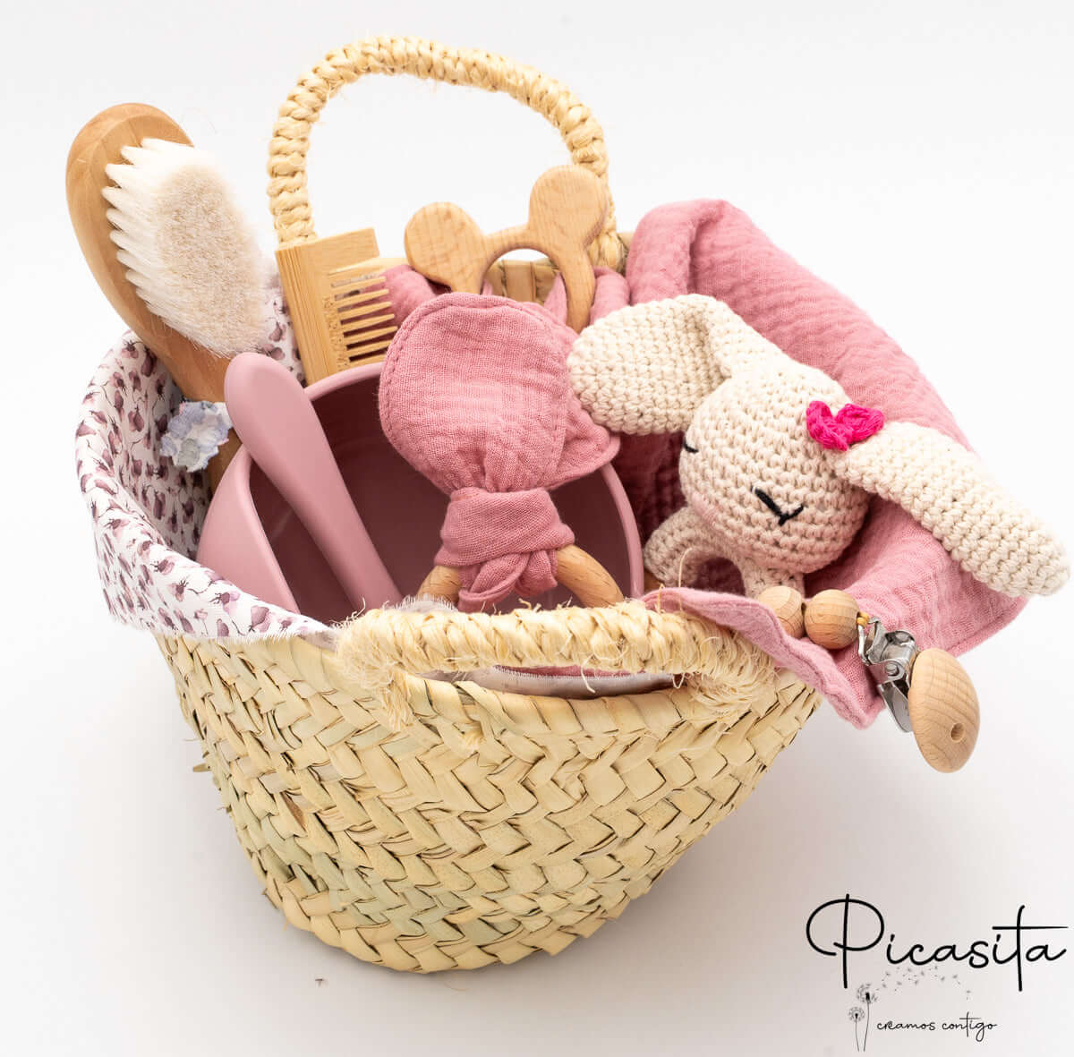 Olvídate de los regalos que acaban olvidados en un cajón. Cada elemento de esta canastilla recien nacido ha sido seleccionado pensando en el día a día del bebé y de sus padres. Desde los primeros cuidados hasta las primeras comidas, este set acompaña a la familia en momentos clave del crecimiento. Es una selección de productos prácticos, fabricados con materiales de alta calidad y con un diseño que enamora por su sencillez y calidez. Se presenta en una preciosa cesta artesanal que, por sí sola, ya es un tesoro.