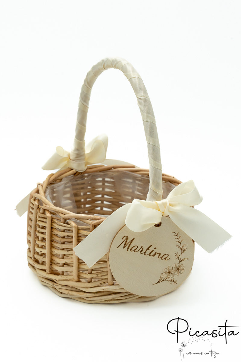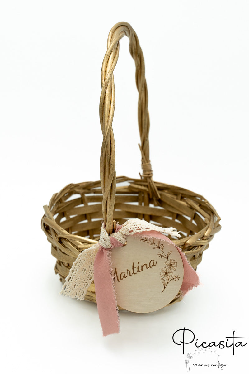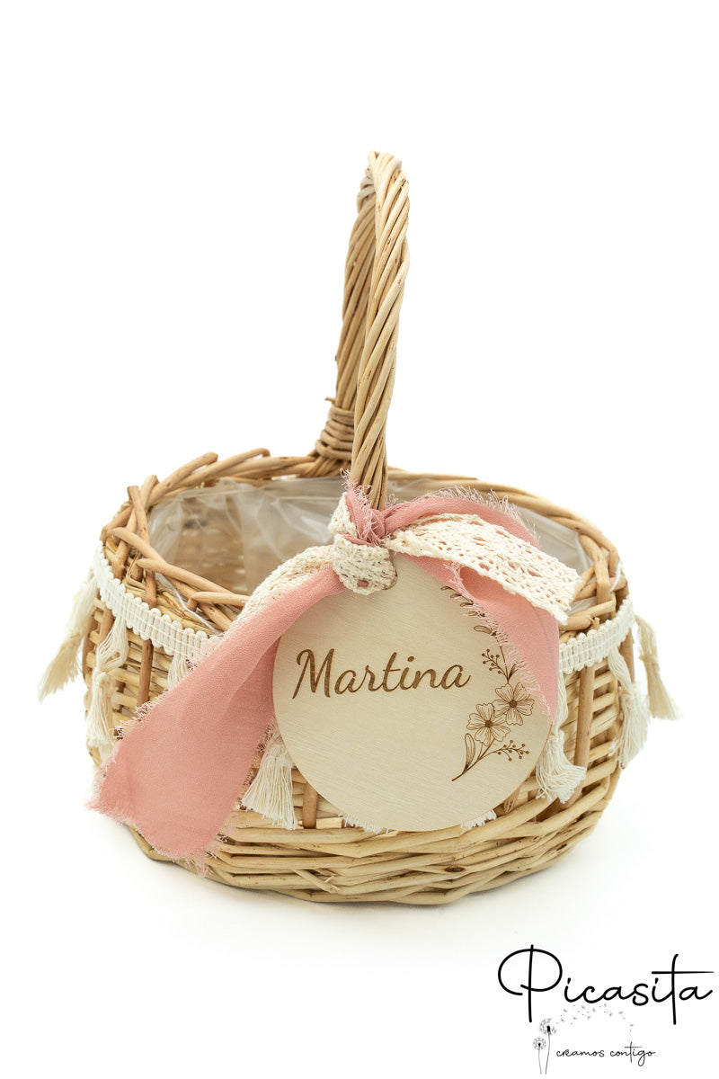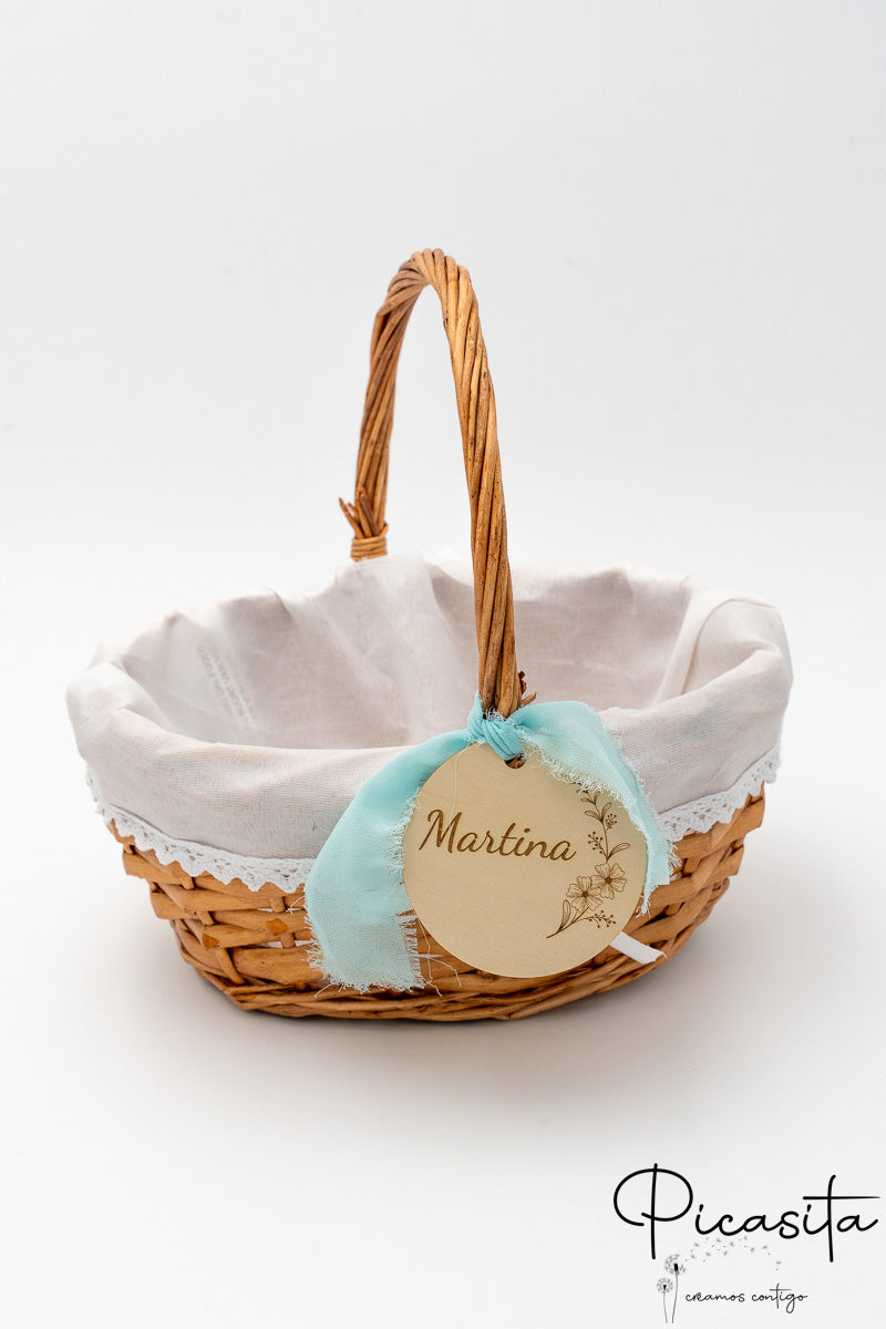 Para hacer que el niño o la niña se sienta parte fundamental del evento, cada cesta incluye un círculo de madera con su nombre grabado a láser. Este detalle no solo personaliza el objeto, sino que lo convierte en un regalo significativo que el pequeño paje podrá conservar. Es una forma preciosa de agradecer su participación y de darle un recuerdo físico de su importante misión. Este detalle transforma un bonito accesorio en un tesoro personal.