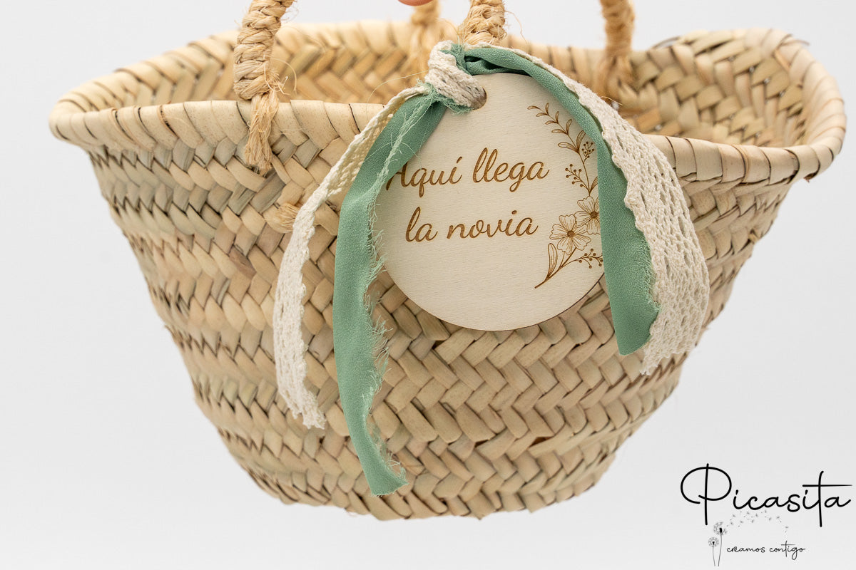 Respuesta: Puedes personalizar completamente el cesto. Incluimos una medalla de madera grabada a láser con el nombre del niño o niña. Además, puedes elegir el color de la cinta de tela que adorna el asa para que combine con la temática de tu boda.
