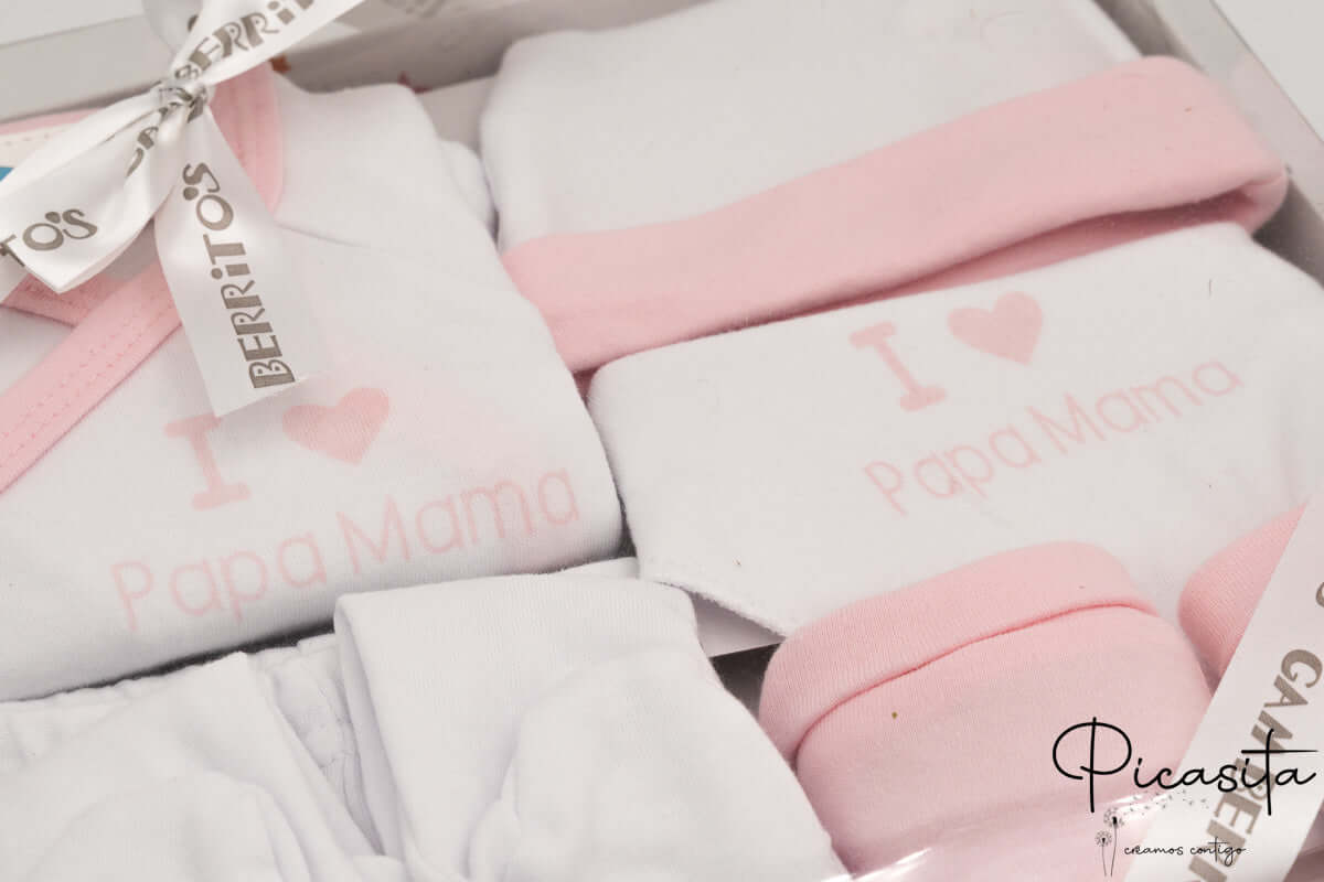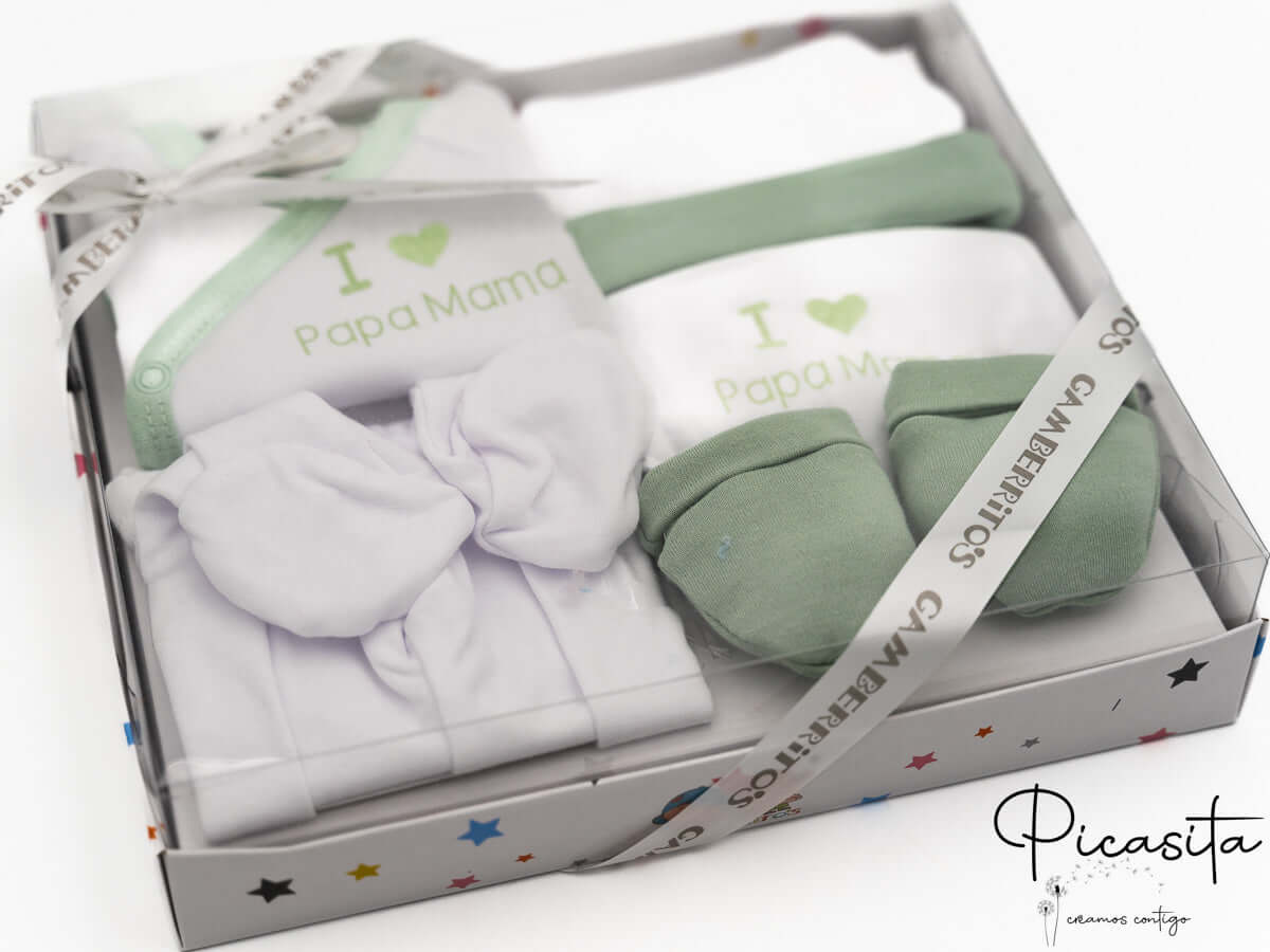 En Picasita nos tomamos muy en serio la seguridad. Por ello, este conjunto primera puesta cumple con los estándares europeos de seguridad textil y la normativa REACH, asegurando que los materiales están libres de sustancias nocivas. Es un producto de alta calidad de la marca Gamberritos, disponible en tres colores clásicos: azul, rosa y un suave verde agua, todos con el tierno detalle impreso "I love Papa Mama".