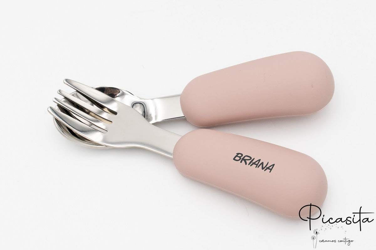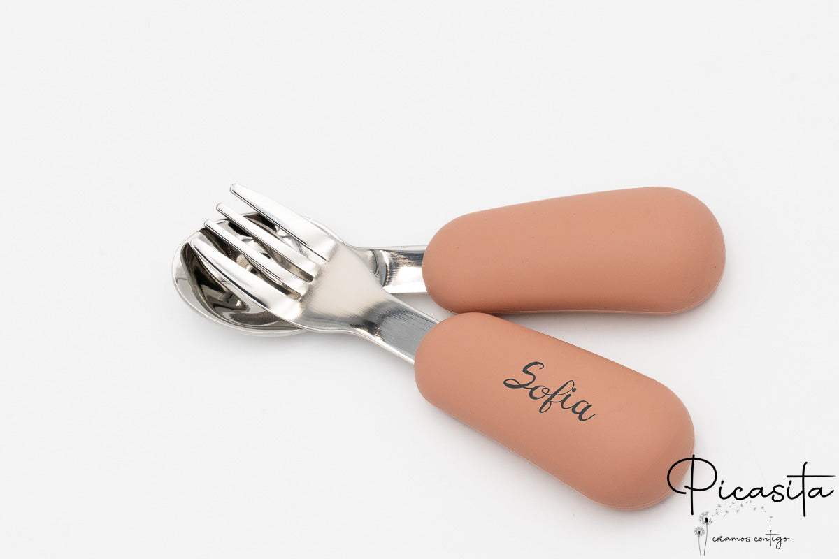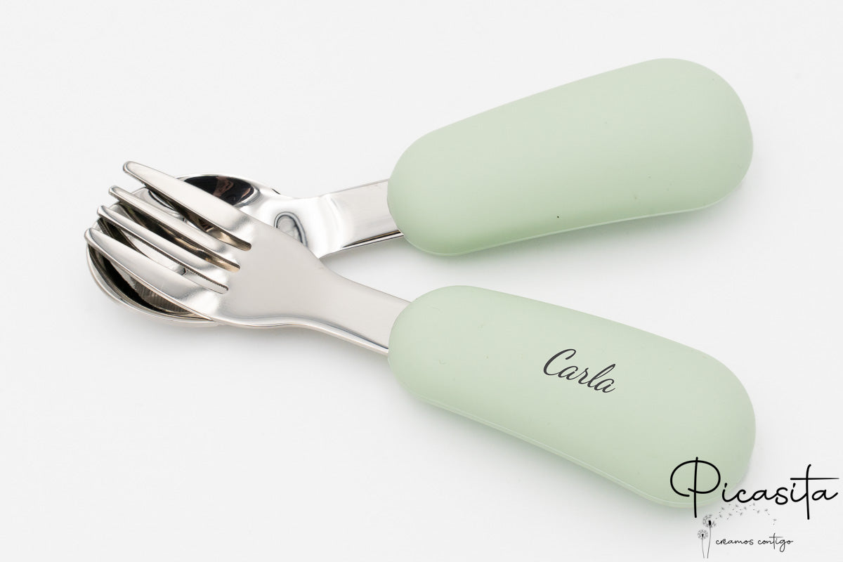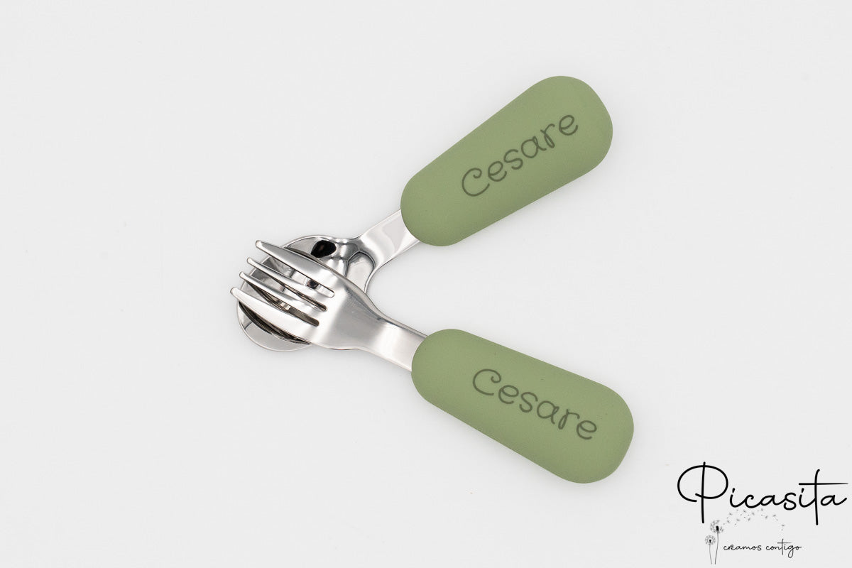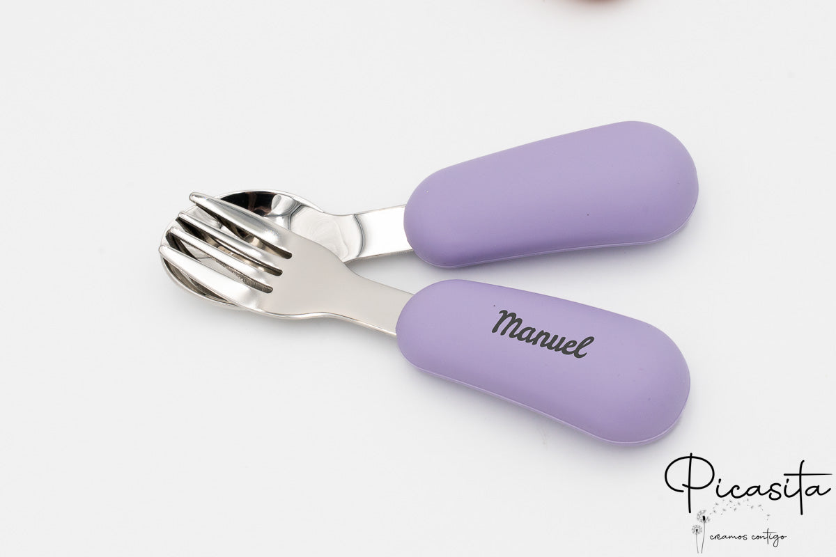 En Picasita.es sabemos que los detalles marcan la diferencia. Por eso, te ofrecemos la posibilidad de crear un cubierto bebe personalizado único. Mediante nuestra técnica de grabado láser de alta precisión, podemos incluir el nombre de tu pequeño o un simpático animalito en los mangos de silicona. El resultado es un acabado monocromo en tono gris oscuro/quemado que es elegante, permanente y totalmente seguro.