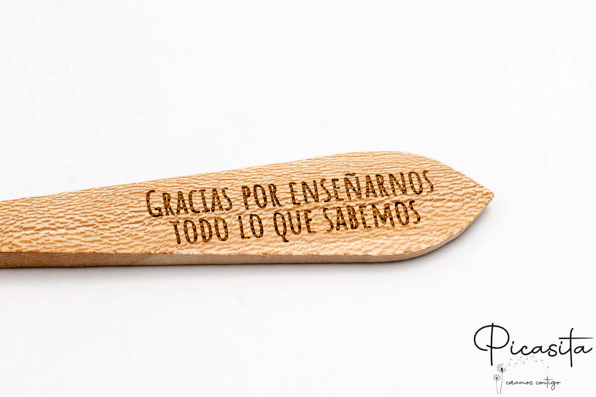 A diferencia de otros métodos que se deterioran, la personalización de este cucharón de madera con nombre se realiza mediante técnica de láser de alta precisión. Este proceso realiza un quemado superficial permanente en tono oscuro, logrando un acabado elegante y artesanal sin el uso de tintas. Puedes elegir grabar un mensaje especial en el mango o incluso un logo en la parte cóncava, asegurando un regalo a cocinero totalmente exclusivo.
