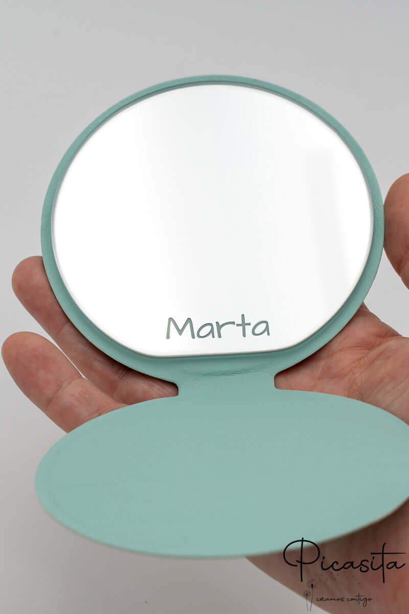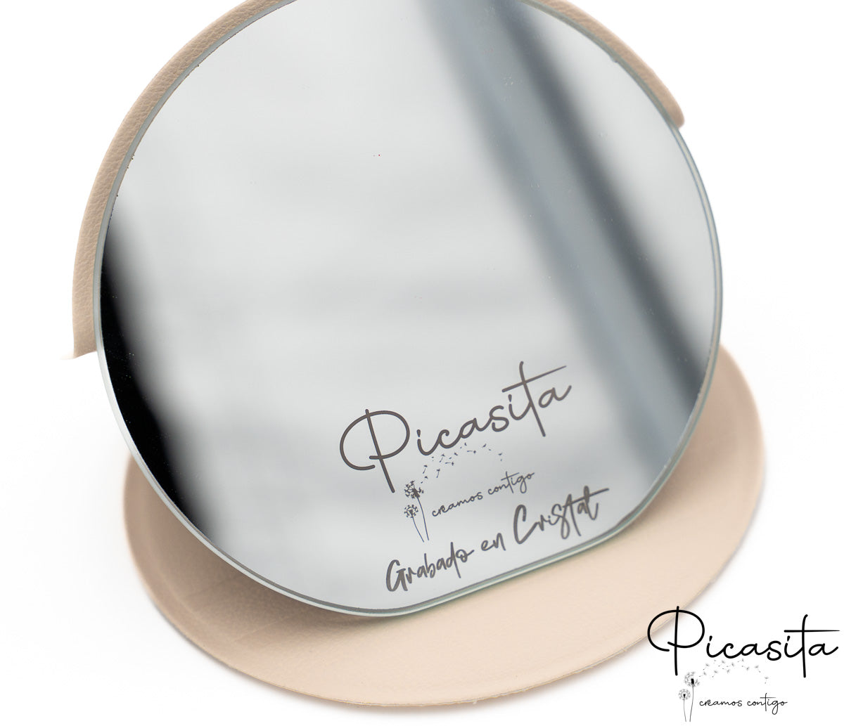 Respuesta: Puedes personalizar la cubierta exterior de cuero sintético en ambos tamaños con nombres, fechas o logos. En el modelo mediano de 9 cm, ofrecemos la opción exclusiva de grabar un nombre directamente en la superficie del espejo.