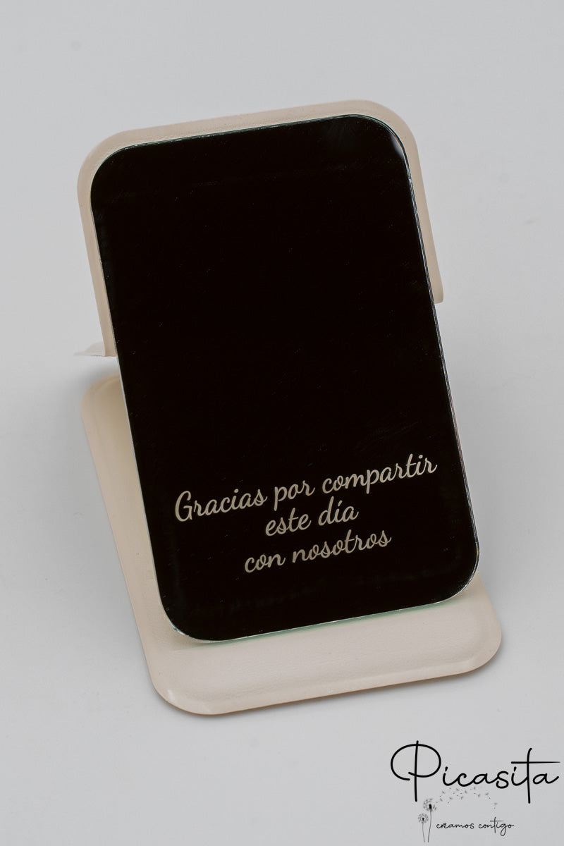 Pensar en un regalo a invitado de bodas es pensar en cómo agradecer su presencia. ¿Y qué mejor manera de hacerlo que con un objeto que combina diseño, calidad y una función práctica? Este espejo es ese tipo de regalo. Es un guiño de complicidad, un accesorio que estará ahí para un retoque antes de una reunión importante, en un viaje o en una salida con amigos. Cada uno de esos momentos llevará consigo una pequeña parte de vuestro recuerdo.