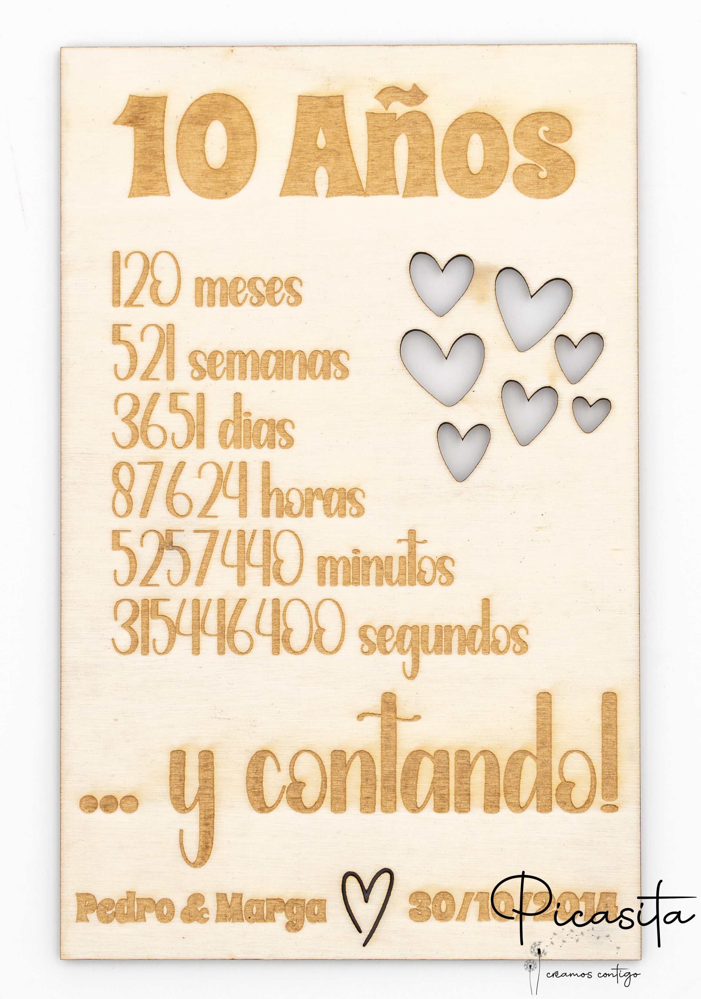 Cada una de nuestras piezas es más que una simple felicitación de aniversario de boda; es una obra de arte personalizada que cuenta vuestra historia. La precisión del corte láser permite crear diseños intrincados y elegantes, mientras que el grabado añade una dimensión táctil y visual que eleva el mensaje. Nos esforzamos por ofrecer un producto que no solo sea hermoso, sino también significativo, convirtiéndose en un recuerdo preciado que adornará cualquier espacio con vuestro amor.