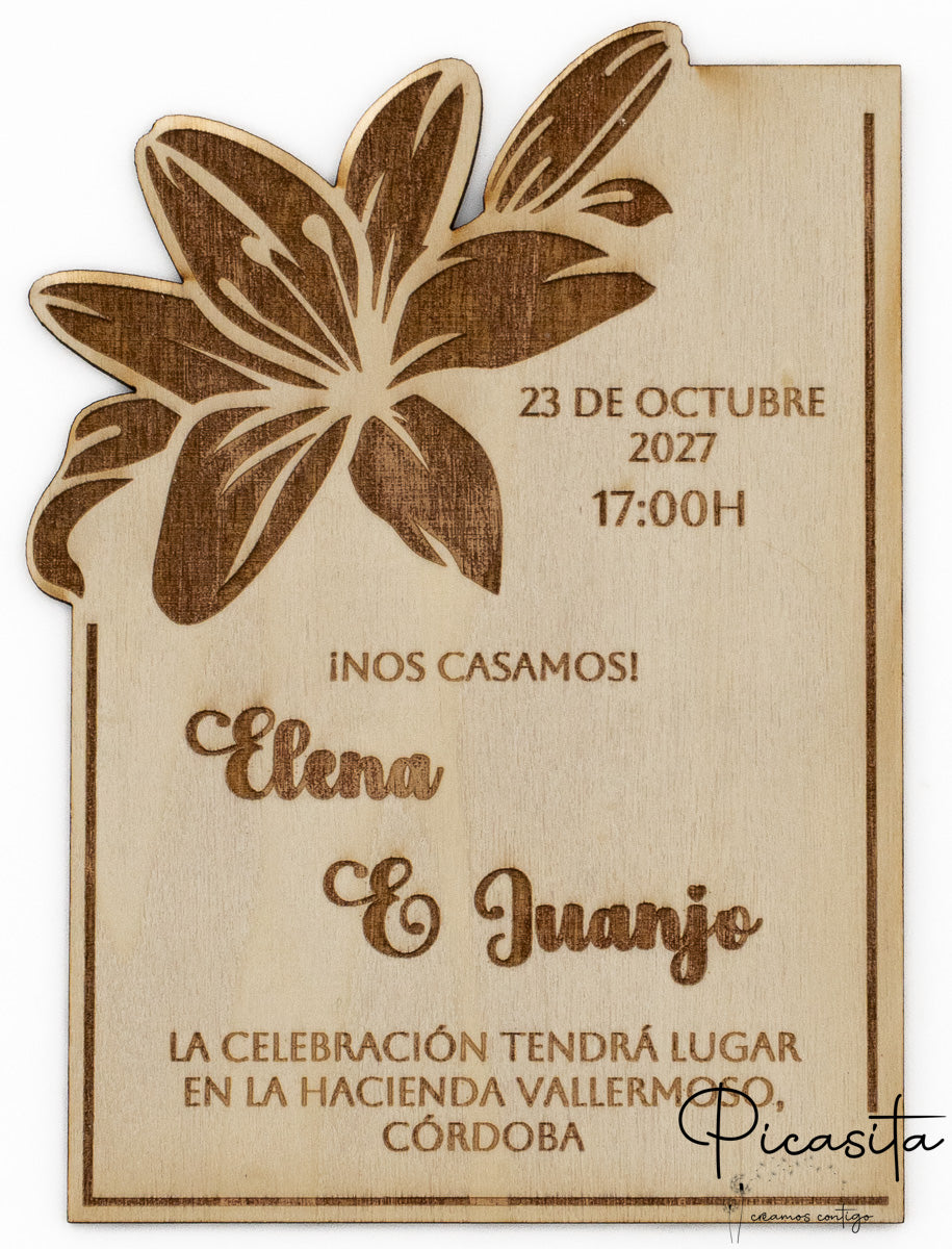 Sabemos que vuestro amor es único, y vuestra invitación debe serlo también. Por eso, en Picasita, la personalización es la piedra angular de cada invitacion de boda de madera. Vuestros nombres, la fecha del gran día, la hora y el lugar de la celebración, e incluso un mensaje personal que resuene con vuestra historia, se grabarán con una precisión milimétrica. La tecnología láser no solo garantiza una nitidez impecable, sino que también crea un contraste visual y un relieve táctil que realzan cada palabra y cada detalle del diseño, asegurando que el texto sea permanente y legible a través del tiempo.