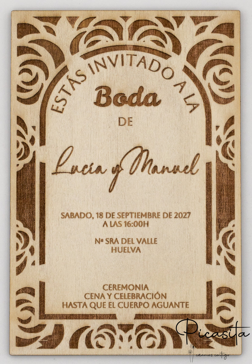 Más allá del texto, la forma y el estilo de vuestra invitacion boda madera pueden ser un fiel reflejo de vuestra personalidad. Ofrecemos una amplia gama de variantes preestablecidas que se adaptan a diferentes gustos y temáticas. Podéis optar por la elegancia sutil de la Curva a la Derecha, con sus delicados motivos florales calados que le confieren un aire romántico; la distinción atemporal del modelo Vintage Rectangular, que evoca un encanto clásico; o las preciosas opciones botánicas como Lirios y Rosas, que añaden un toque natural y sofisticado. Para las parejas que buscan una estética más contemporánea, el diseño en forma de Arco ofrece una modernidad sorprendente. Pero la creatividad no tiene límites: si tenéis una idea específica, un símbolo que os represente o una forma completamente nueva en mente, estamos aquí para escucharos. Nuestro equipo puede explorar otros acabados y formas para crear una invitacion de boda de madera que sea verdaderamente vuestra, una pieza grabada en madera y recortada con una forma personalizada que nadie más tendrá.
