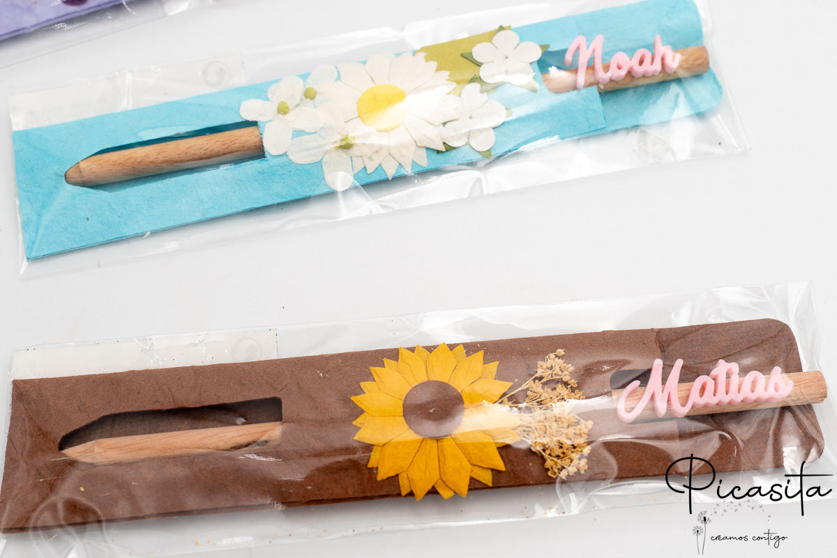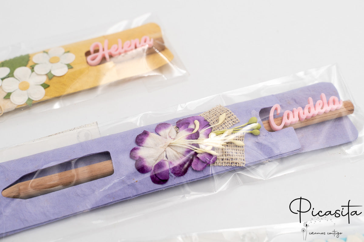 Pack de 6 lápices de madera natural presentados en fundas individuales de colores decoradas con motivos florales. Cada lápiz incluye el nombre del invitado realizado mediante tecnología de impresión 3D, convirtiéndolo en un detalle único y personal. Diseñados especialmente para eventos y celebraciones, estos lápices combinan la calidez de la madera con una presentación artesanal y colorida.