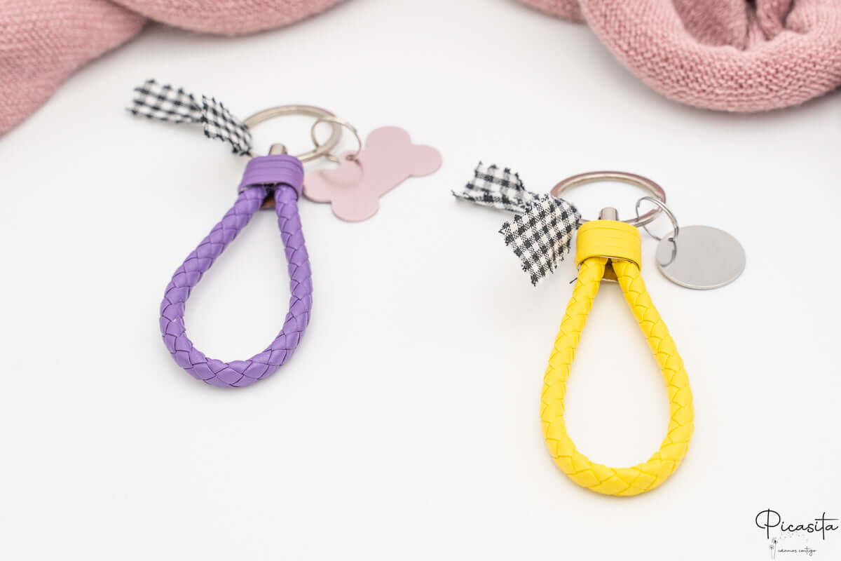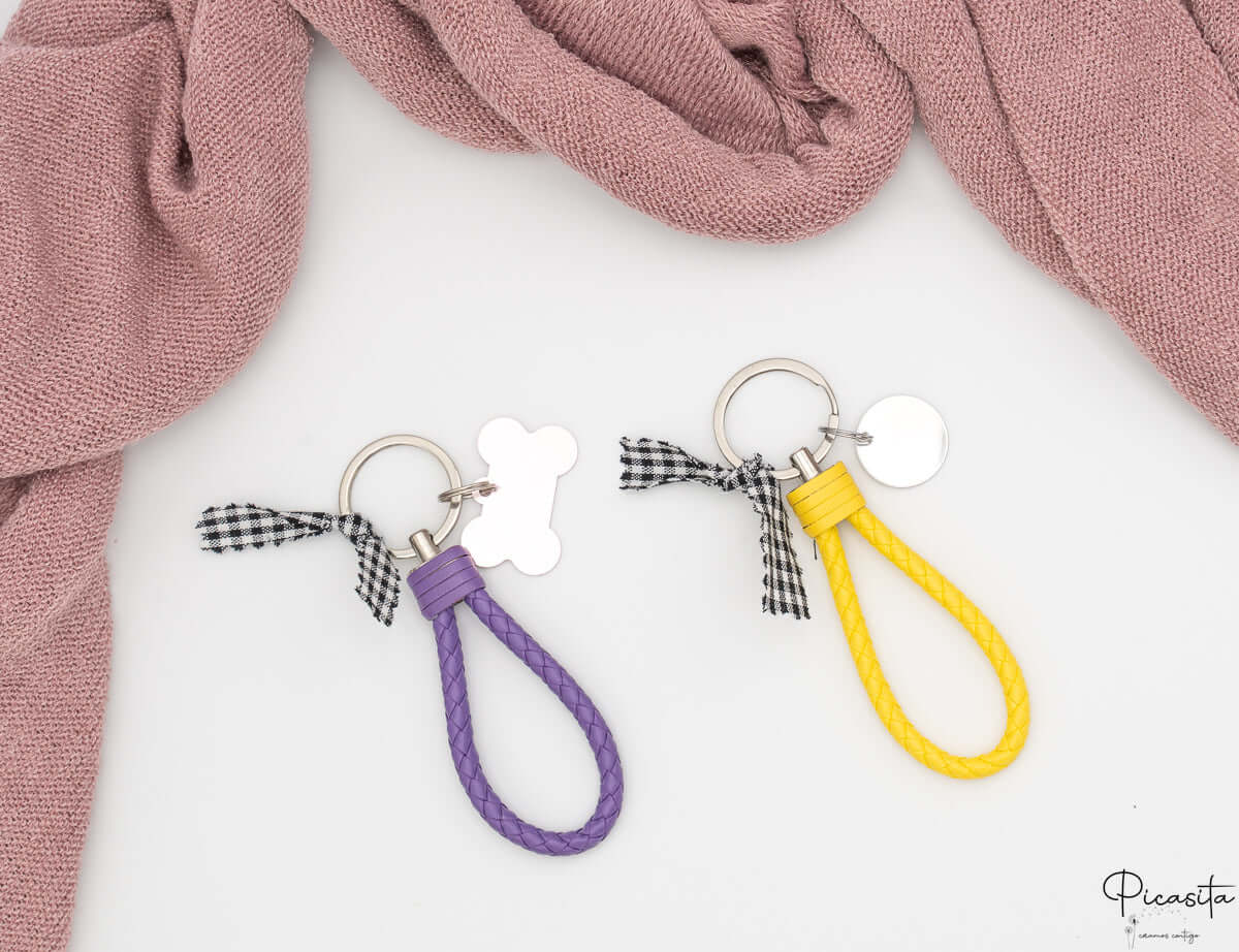 Descubre nuestro llavero que combina un diseño moderno con la personalización más significativa. La protagonista es una llamativa correa trenzada de cuero PU, disponible en colores vibrantes como el lila o el amarillo, que ofrece un tacto agradable y un look diferente.