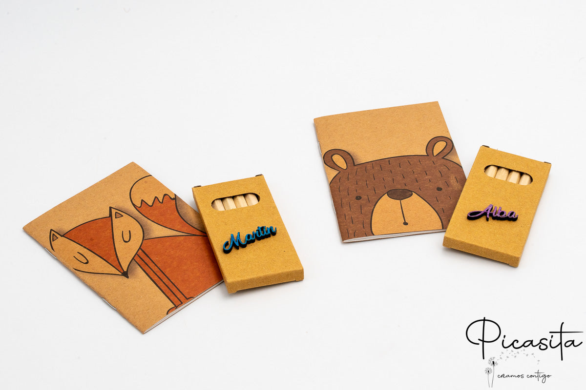 Ofrecemos una selección variada que incluye dominó en caja de madera, yoyó, tres en raya, lápices con nombre en relieve y sets de libreta con lápices (en tubo o caja plana), todos fabricados con materiales naturales.