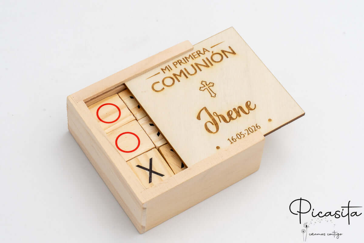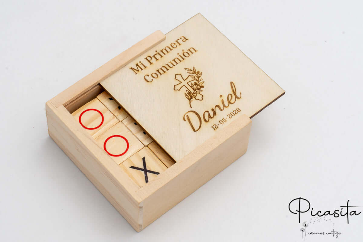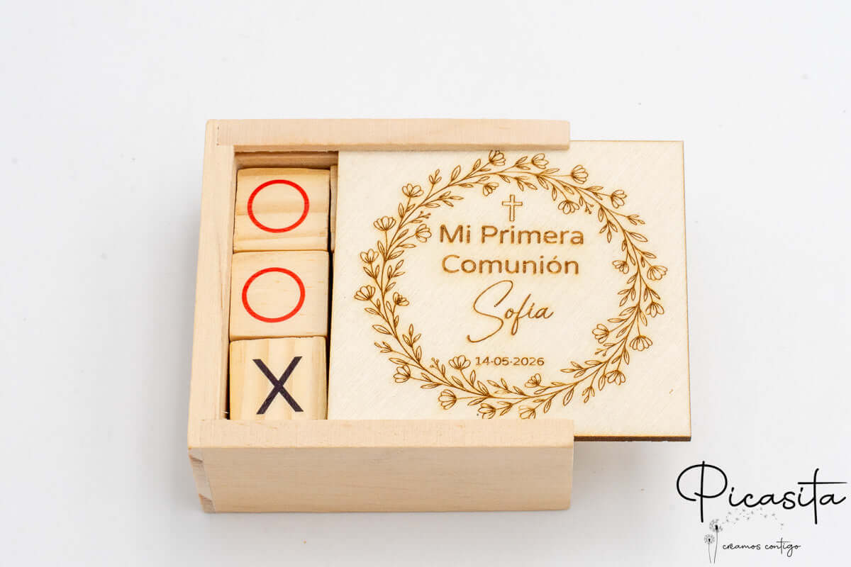 Lo que realmente transforma un simple detalle en un tesoro es la personalización. Cada regalo invitados niños de esta colección se personaliza mediante tecnología de corte y grabado láser. Este método funde y tuesta ligeramente la superficie de la madera o el cartón, dejando un diseño permanente, elegante y con un relieve táctil fascinante. Ya sea grabando el nombre de cada pequeño invitado en un lápiz de madera, o plasmando la fecha y el nombre del protagonista en la tapa de un juego de tres en raya, el láser garantiza un nivel de exclusividad que hará que cada niño se sienta especial e importante durante tu celebración.
