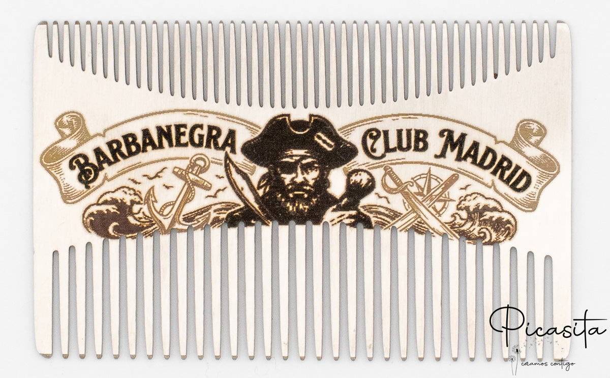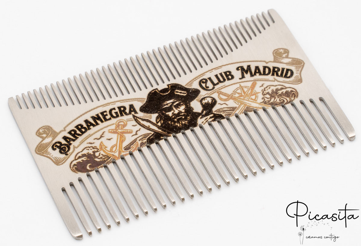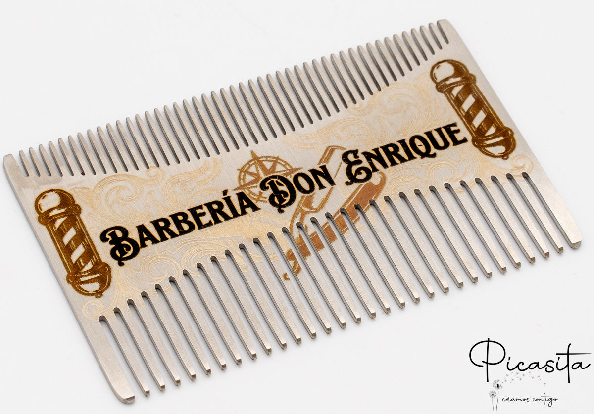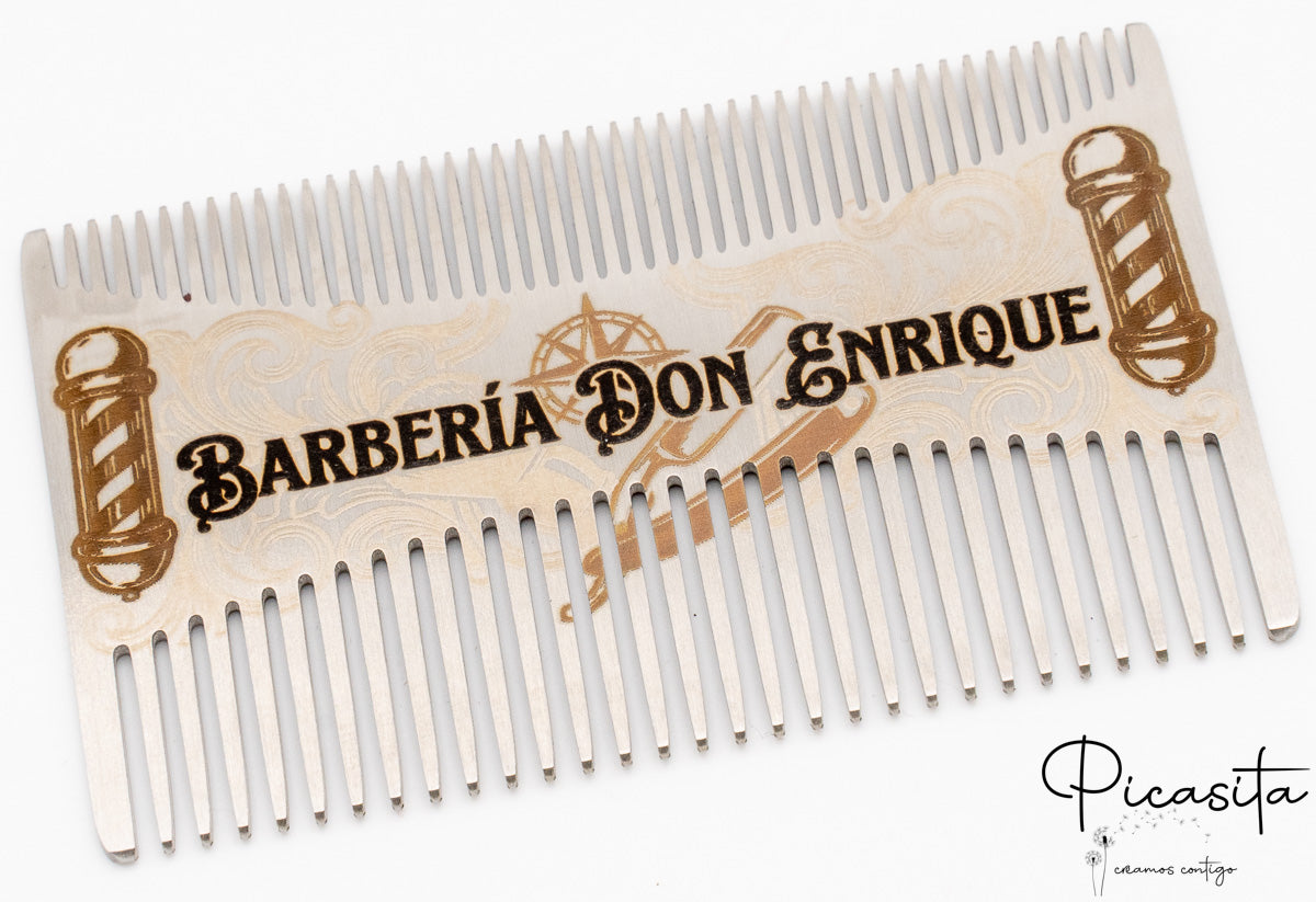 Lo que realmente distingue a nuestros peines para barba es la posibilidad de hacerlos únicos. Gracias a nuestra tecnología de grabado láser de alta precisión, convertimos esta pieza en un peine personalizado con tu nombre, iniciales, una fecha especial o el logotipo de tu negocio. El acabado es un elegante tono oscuro sobre el metal, permanente y resistente al desgaste.