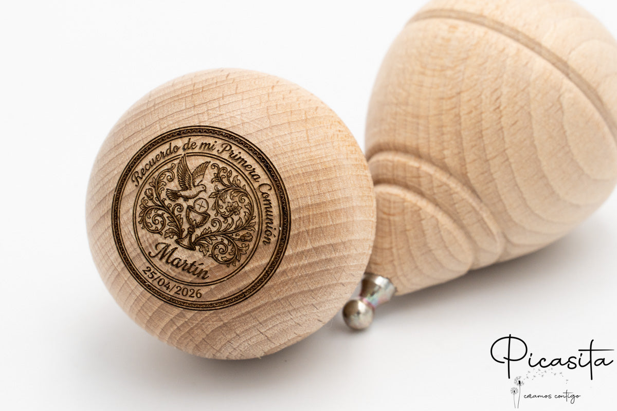 Cada peonza personalizada de nuestro catálogo en picasita está fabricada en resistente madera de haya. Hemos diseñado este modelo específicamente sin bombín en la parte superior para ofrecer una superficie amplia y lisa, ideal para el grabado. Al ser una peonza regalo comunion, la durabilidad es clave: la personalización se realiza mediante grabado láser de alta precisión. Esta técnica quema la madera, dejando un acabado elegante en tonos negros o marrón oscuro que no se borra con el uso, a diferencia de las pegatinas o tintas superficiales. Ten en cuenta que al ser láser, el diseño no tiene color, sino el tono natural del quemado de la madera.