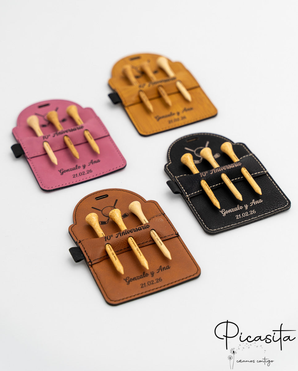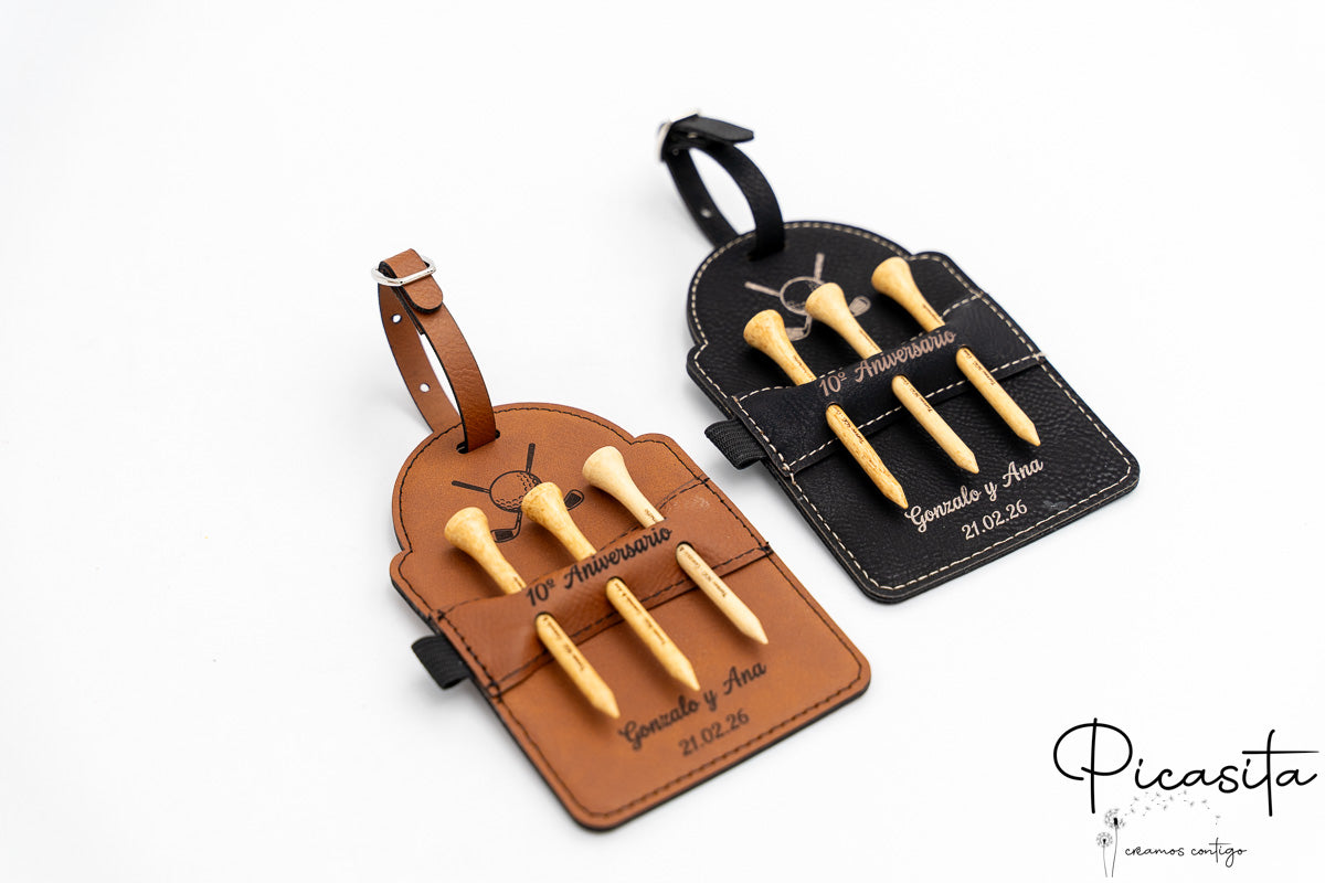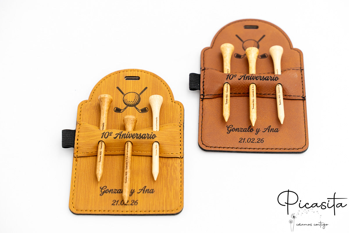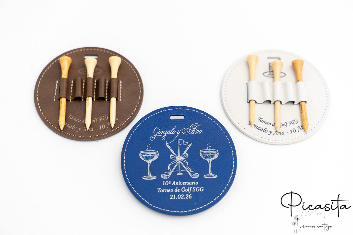El portatees personalizado de Picasita es el accesorio imprescindible para cualquier amante del golf. Diseñado en elegante cuero sintético, este práctico organizador permite llevar los tees siempre a mano durante el juego. Incluye una correa a juego para sujetarlo cómodamente al cinturón o a la bolsa. Disponible en formato redondo y rectangular, se personaliza mediante grabado láser de alta precisión, garantizando un acabado duradero y profesional, ideal para regalos de empresa, torneos o aniversarios.