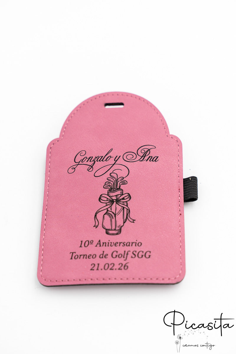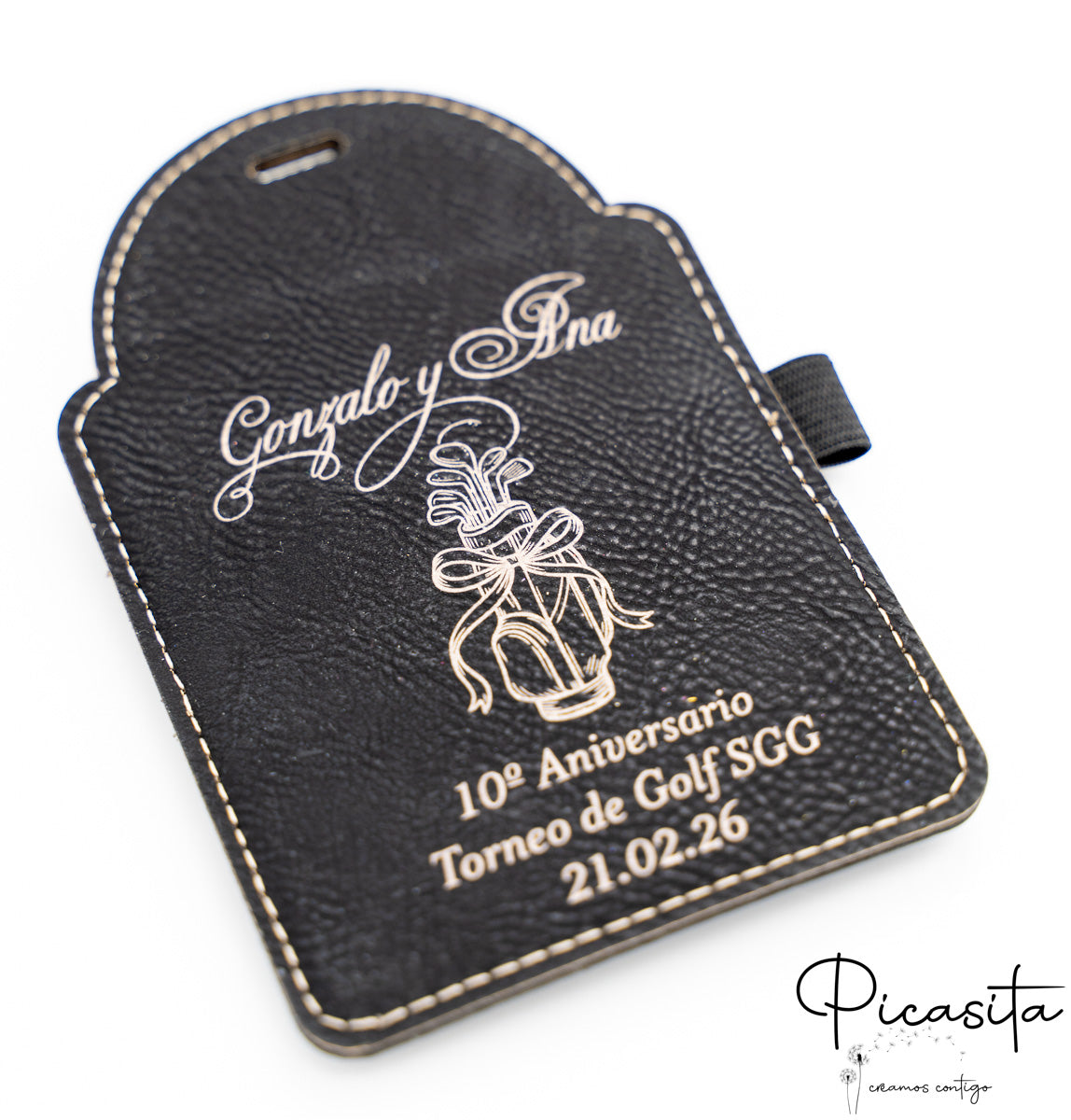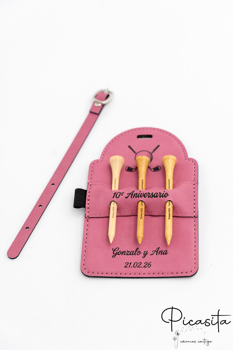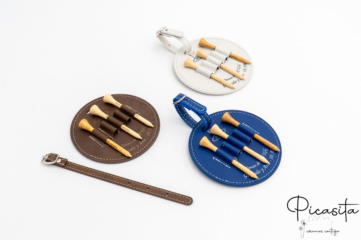 El portatees personalizado de Picasita es el accesorio imprescindible para cualquier amante del golf. Diseñado en elegante cuero sintético, este práctico organizador permite llevar los tees siempre a mano durante el juego. Incluye una correa a juego para sujetarlo cómodamente al cinturón o a la bolsa. Disponible en formato redondo y rectangular, se personaliza mediante grabado láser de alta precisión, garantizando un acabado duradero y profesional, ideal para regalos de empresa, torneos o aniversarios.