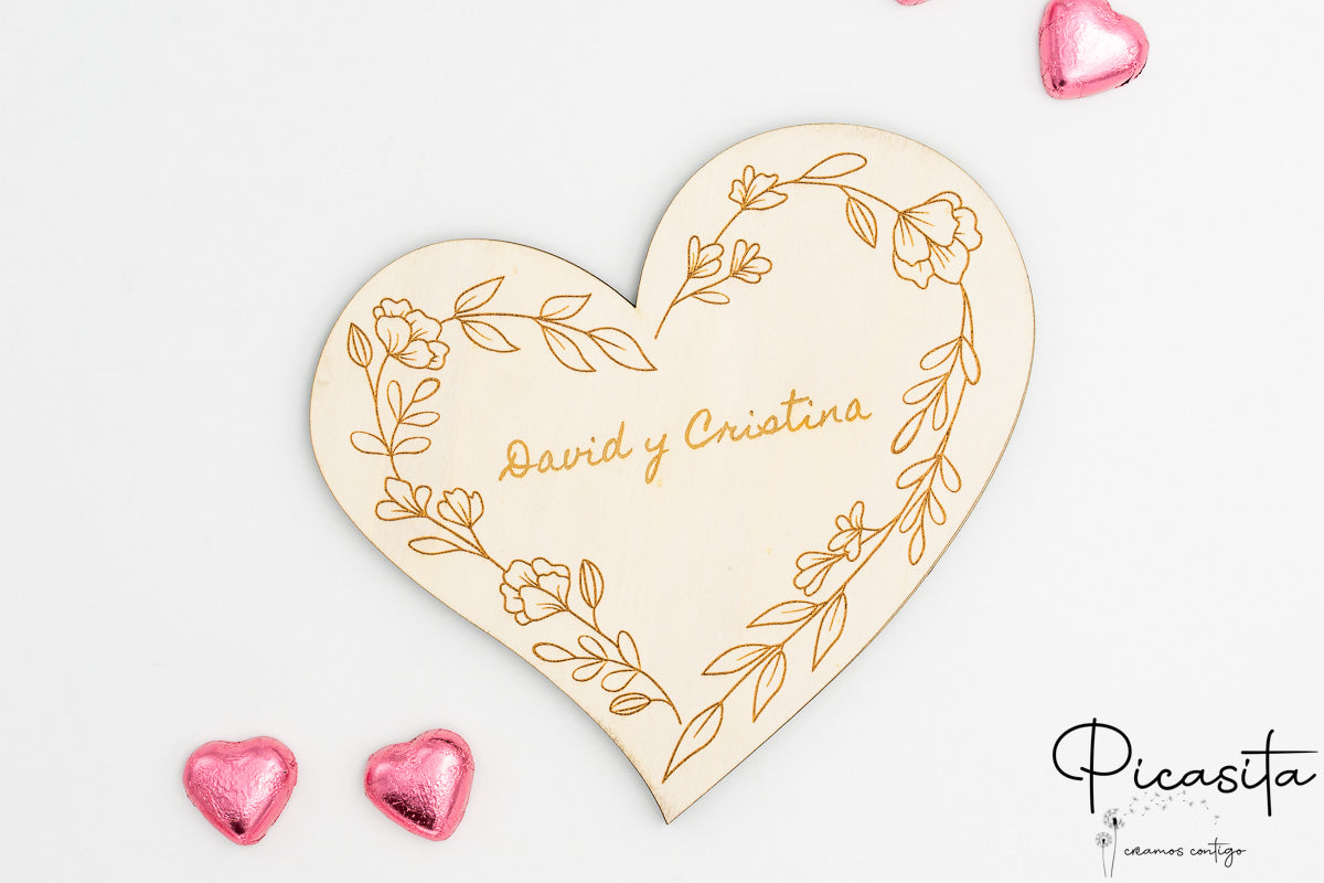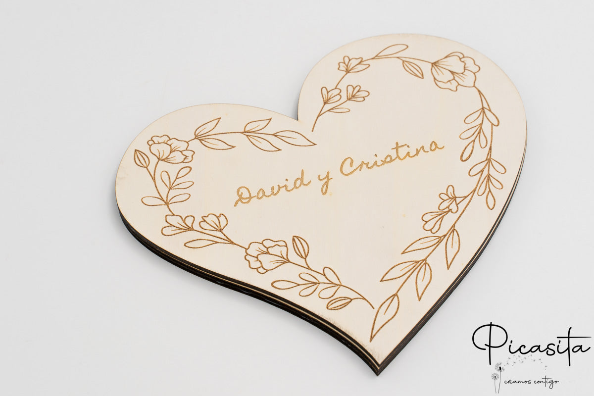 Lo que hace único a este producto es la delicadeza de su acabado. Utilizamos tecnología de láser de alta precisión para grabar los textos y el diseño floral de la tapa. Al no utilizar tintas, el resultado es un quemado superficial sobre la madera en tono oscuro, elegante y permanente, que no se borrará con el paso del tiempo. Es un regalo de novios pensado para durar y decorar vuestro rincón favorito del hogar.