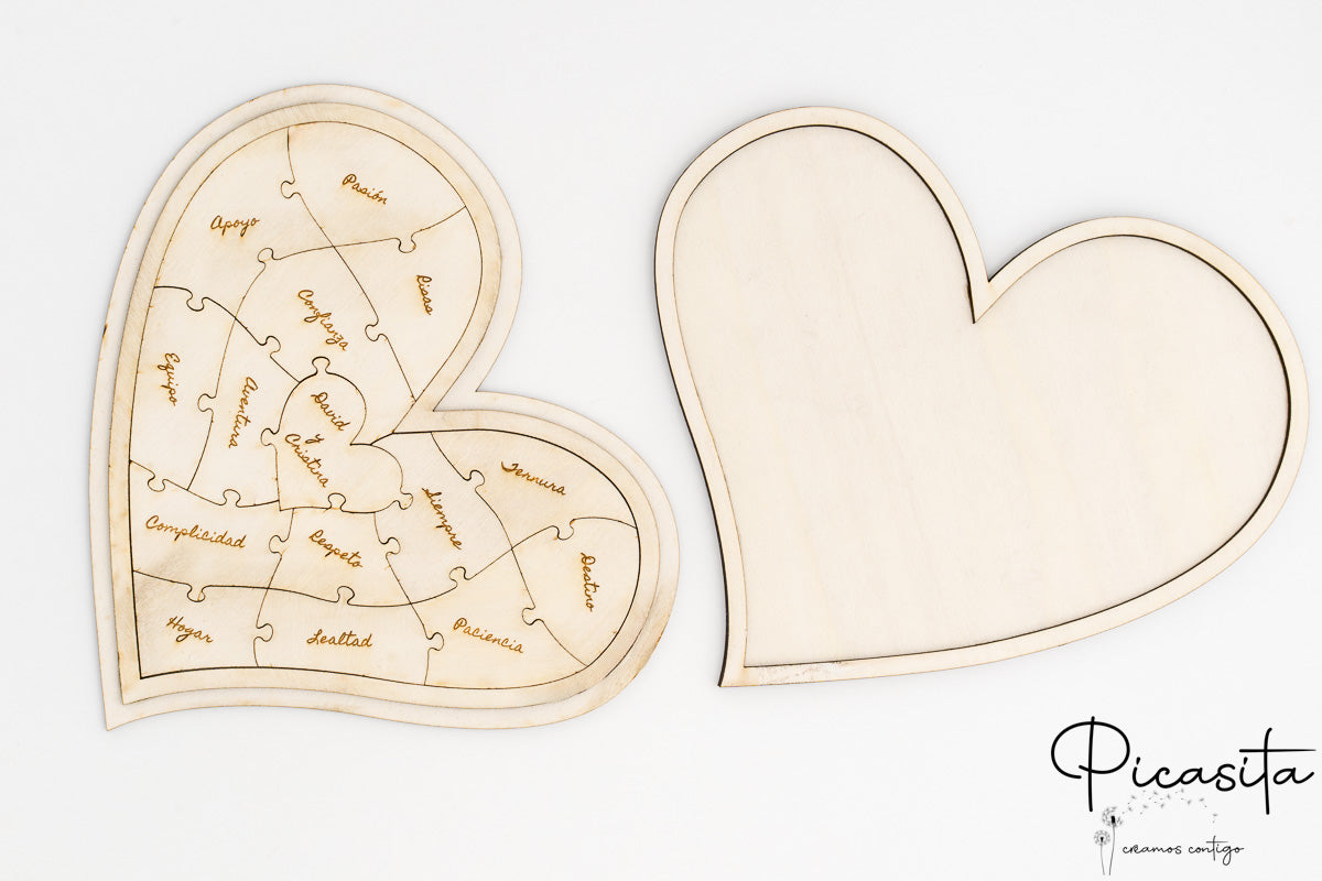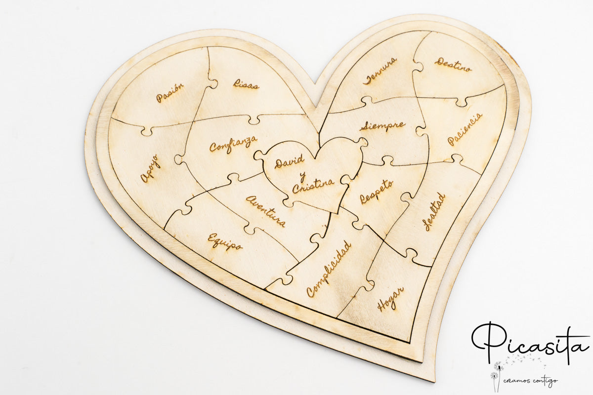 Este puzzle enamorados está fabricado en madera natural de alta calidad y consta de piezas que encajan a la perfección. Cada una de ellas lleva grabada una de las 14 palabras que definen los pilares de una relación sólida: confianza, pasión, risas, apoyo, aventura, entre otras. En el centro, uniendo todo, se encuentra la pieza más importante personalizada con vuestros nombres, simbolizando que vosotros sois el núcleo de todo ese amor.