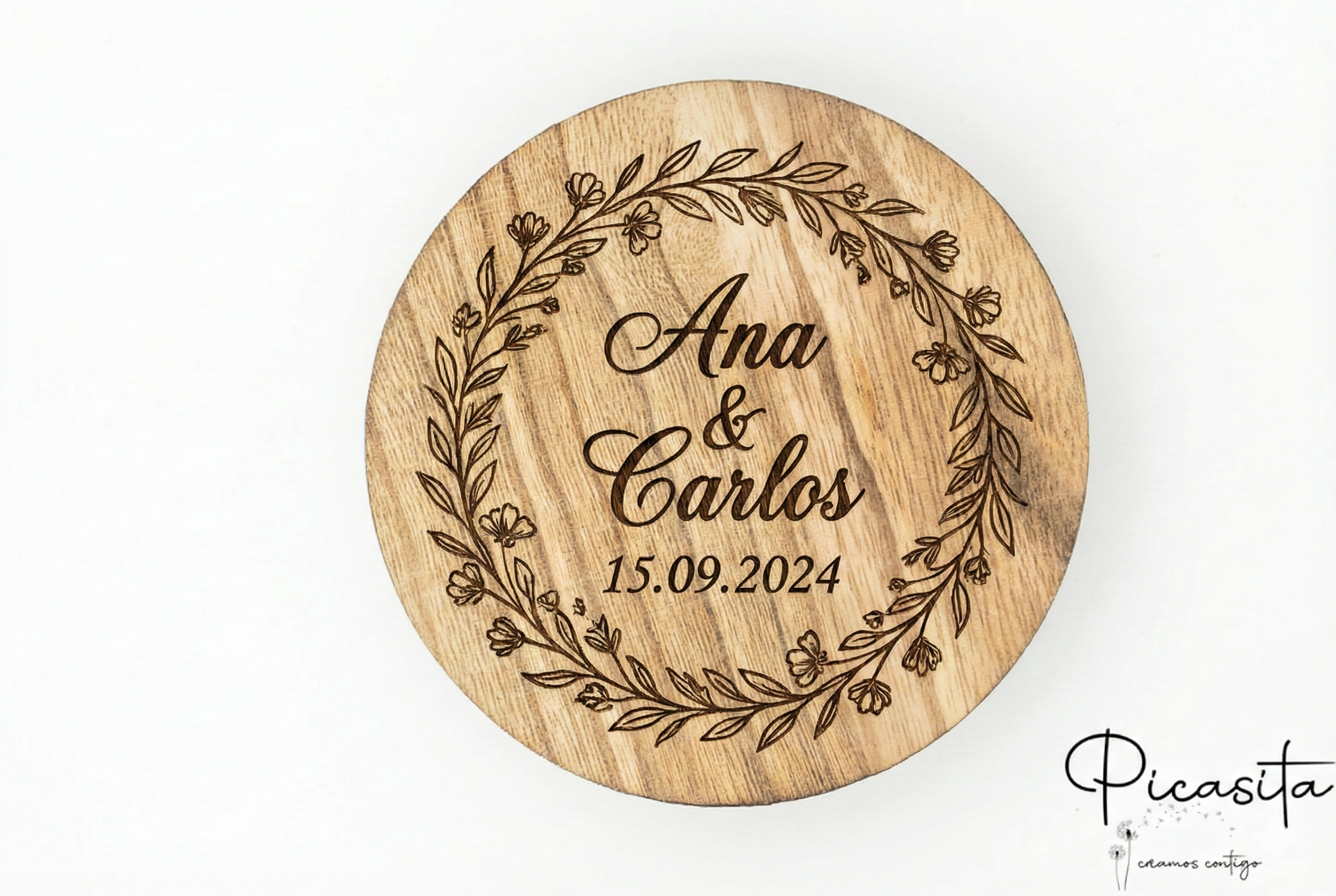 Respuesta: Puedes personalizar el soporte con los nombres de los novios y la fecha de la boda o evento. Esta información se graba con láser directamente sobre la superficie de madera.
