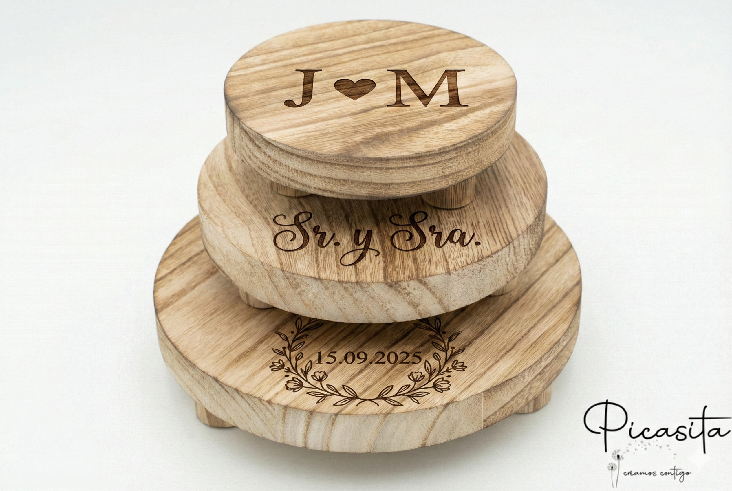 Lo que realmente convierte a este objeto en una pieza central es su capacidad de personalización. No es un simple accesorio; es un lienzo para vuestros recuerdos. Mediante una precisa técnica de grabado láser, inmortalizamos en la madera los nombres de los novios y la fecha de la celebración. Este detalle transforma un práctico expositor bodas en un recuerdo tangible de vuestro gran día. Cada vez que vuestros invitados se acerquen a la mesa, no solo verán una presentación cuidada, sino también un símbolo de vuestra unión.