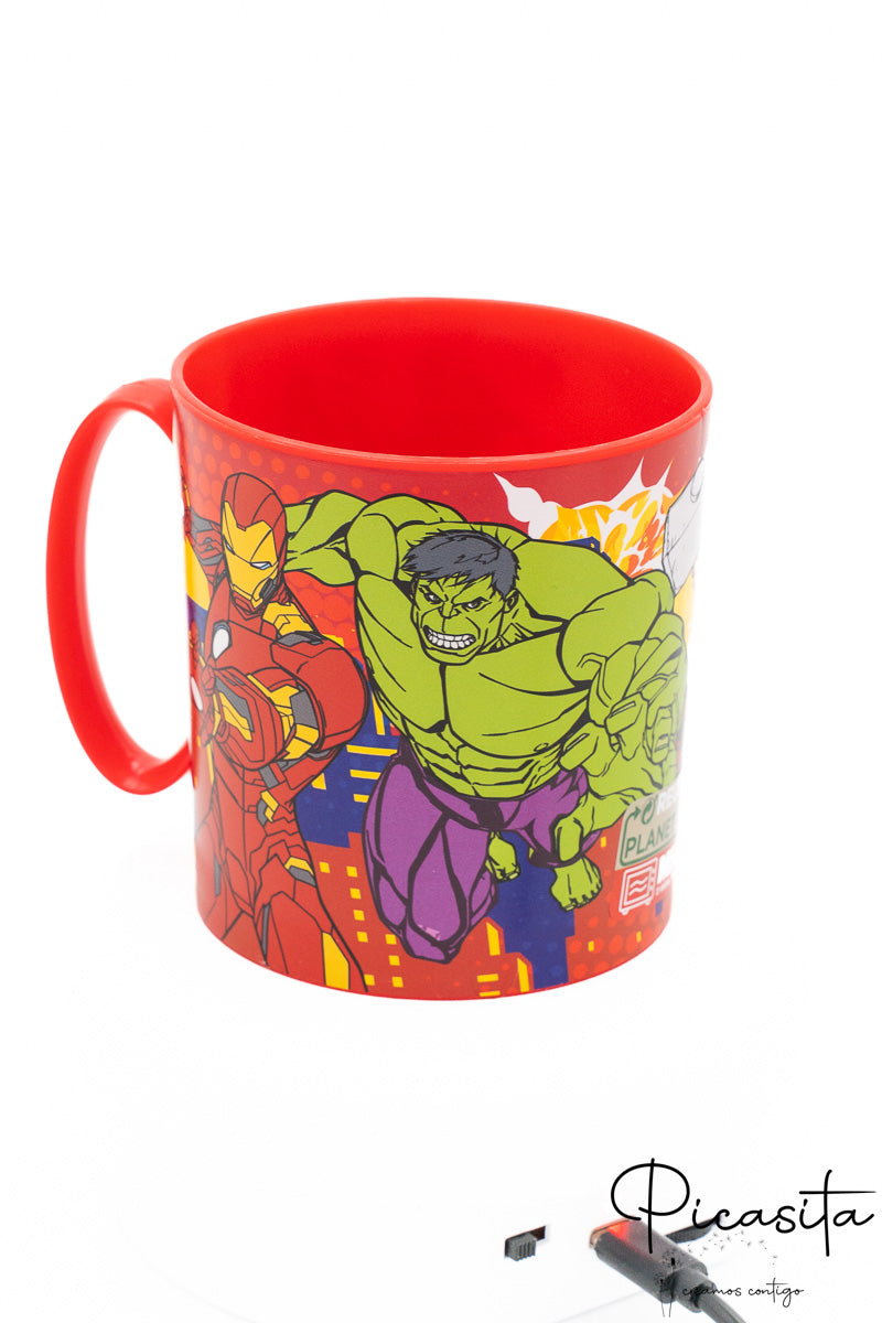 Respuesta: La taza presenta un diseño vibrante con los icónicos héroes Hulk, Capitán América, Thor e Ironman, listos para acompañarte en tus desayunos y momentos de ocio.