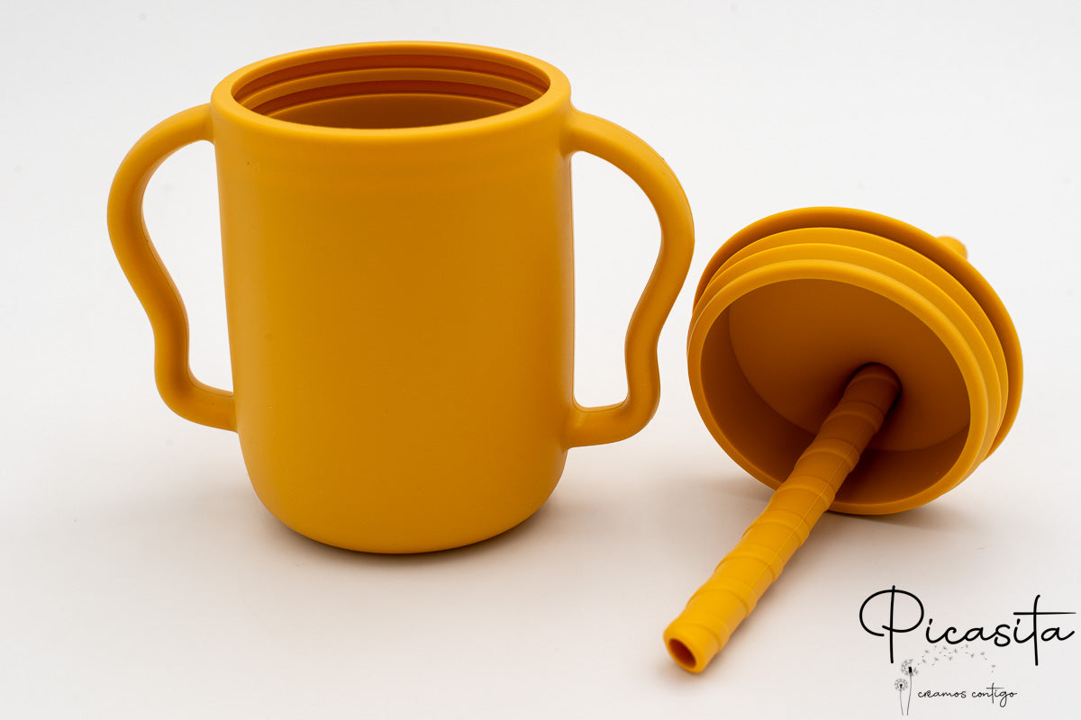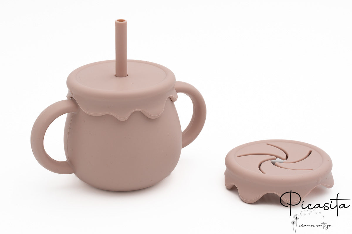 Dentro de nuestra colección, encontrarás variantes con diseños únicos que enamoran a primera vista. El modelo Tarro de Miel simula con su tapa un dulce bote de miel derramándose, un detalle visual que lo hace especialmente apetecible y divertido. Por otro lado, el diseño con Orejas de Elefante incorpora unas asas con una forma lúdica y ergonómica que no solo son encantadoras, sino que también facilitan un agarre firme y seguro para las manos más pequeñas.