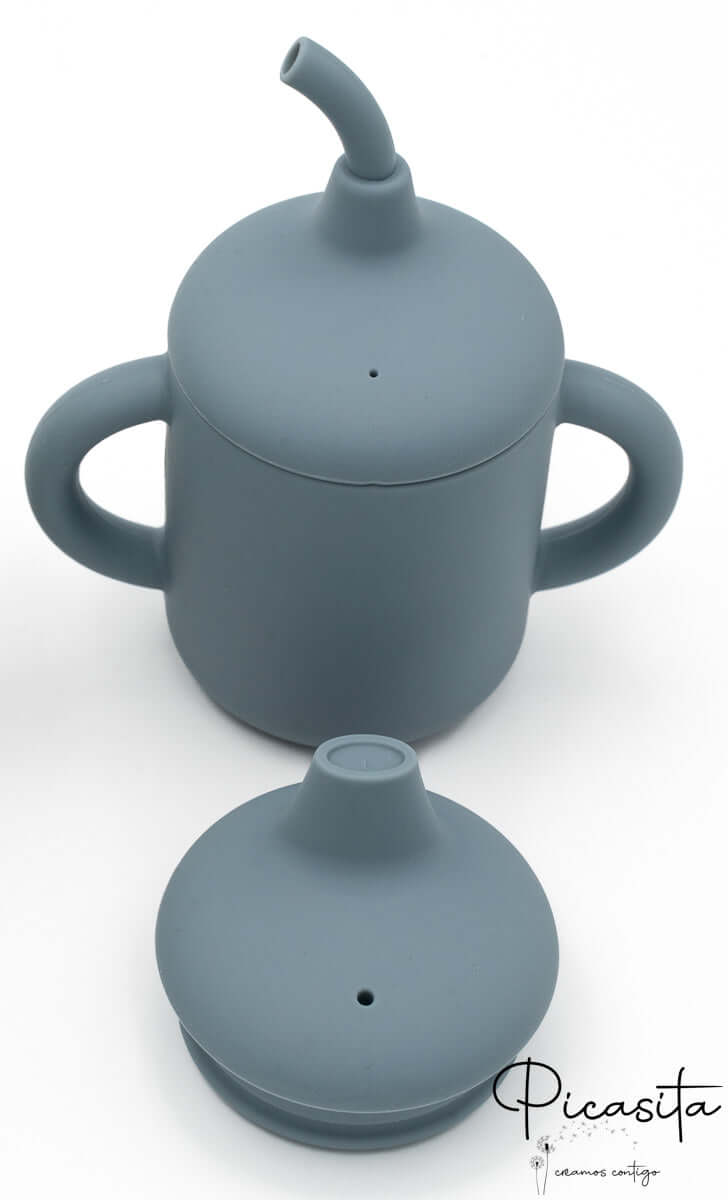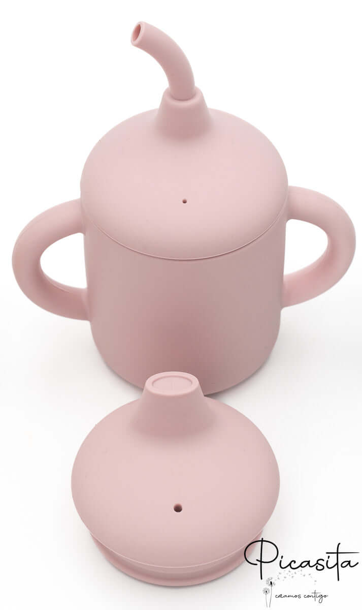 Respuesta: La primera tapa, diseñada como vaso de succión, tiene un sistema antiderrame muy eficaz que limita el flujo y evita fugas cuando el vaso se inclina o se agita, lo cual es ideal para la fase de aprendizaje. La segunda tapa con pajita permite un flujo libre, por lo que no es antiderrame.